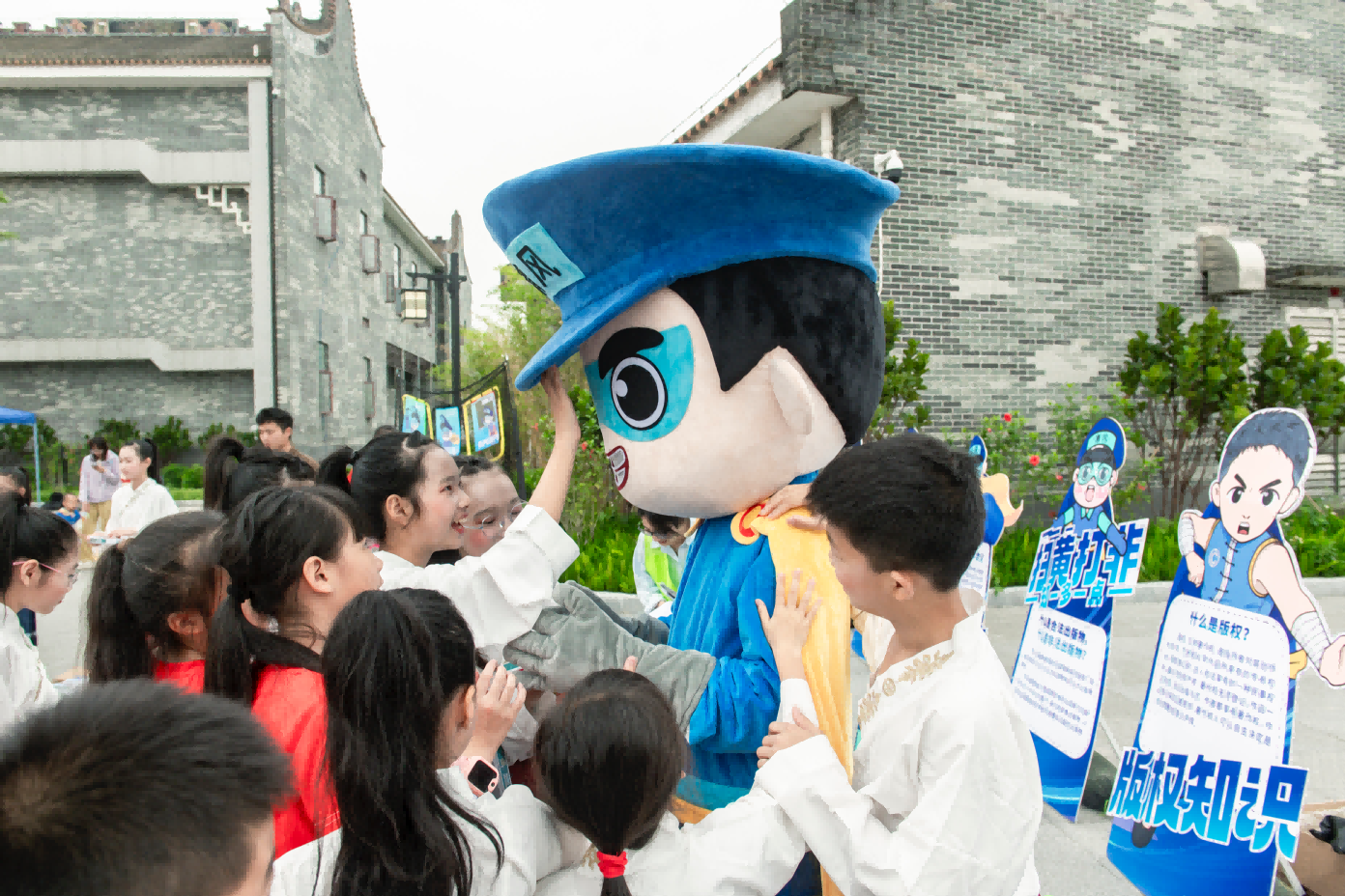 广州“扫黄打非”形象代言清风侠人偶来到活动现场与青少年互动。