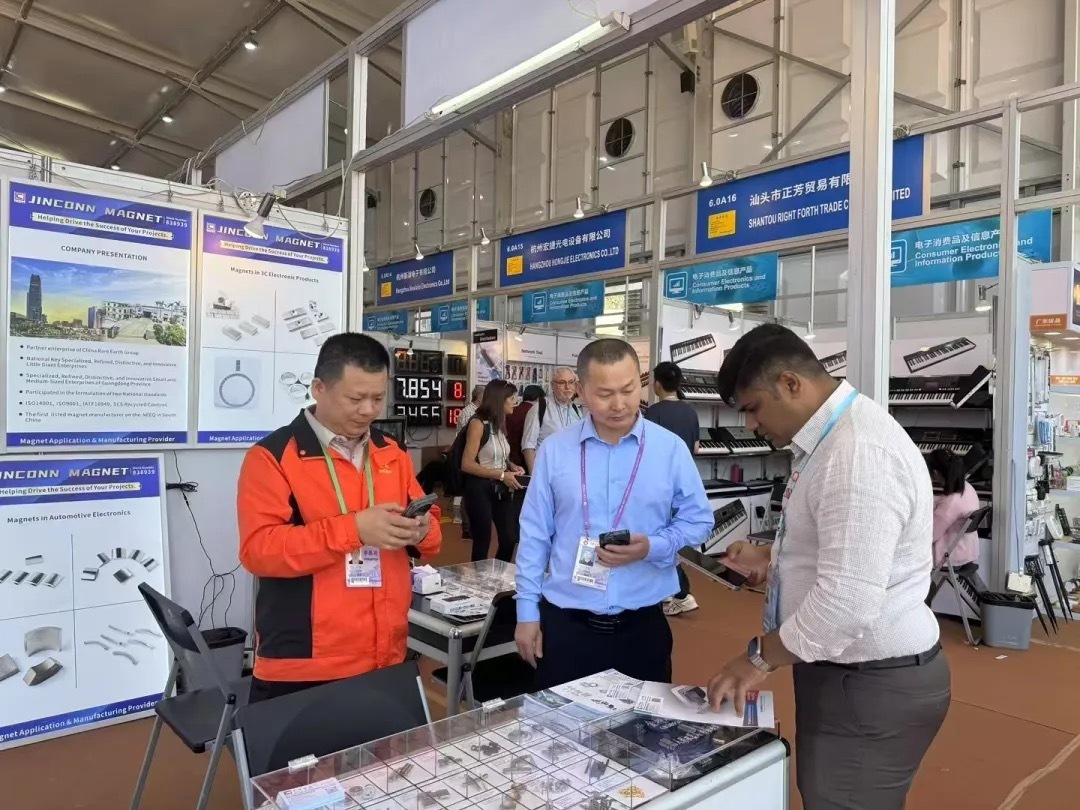 其中,作为国家专精特新重点“小巨人”企业,东莞金坤新材料股份有限公司(以下简称“金坤新材”)在广交会一期“电子消费品及信息产品”展区大放异彩。其展出的“人形机器人关节磁组件”及“新能源汽车ABS制动系统磁体”等核心产品,凭借高磁能积、耐高温等性能优势,吸引多家采购商驻足洽谈。