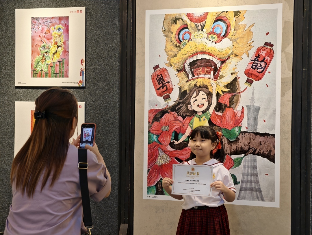 活动现场还展出了50幅广州市中小学生在2024年“粤韵杯”赛事中的优秀绘画作品,吸引了众多目光。这些作品充满了童真与创意,蕴含着早茶点心、粤剧、龙舟、广州塔、陈家祠等岭南文化元素,色彩丰富、笔触细腻、想象大胆,直观展示出岭南文化的独特魅力与广州城市的现代发展。