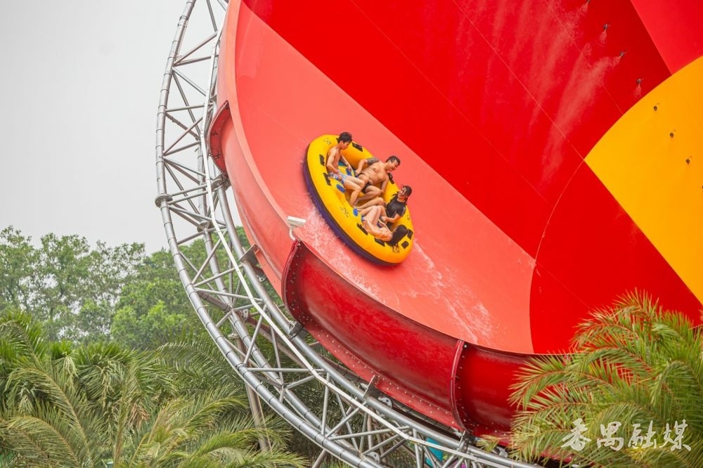 当游客乘坐上专用橡皮圈从塔顶飞速俯冲滑入时,一瞬间便进入蜂巢般的螺旋迷宫滑道。风暴双响炮以33米擎天巨塔般的震撼高度将传统大喇叭的刺激指数推向新高潮;随着控制台“3、2、1”的倒计时,滑艇如同被隐形巨手推出,磁力炮水上过山车将带领游客,以11米/秒的速度穿梭在近500米长的水陆轨道,用科技演绎现实版“速度与激情”;搭载加拿大宝澜全新推出的HIVE(螺旋迷宫滑道),冲天双浪板的260米超长滑道蜿蜒如巨蟒盘踞天际,离心力将身体甩向赛道边缘,失重感如潮水般反复冲刷神经,让游客直呼“过瘾”。“实在太惊险了,整个过程基本处于失重状态,我都不敢睁开眼睛,是我玩过的最好玩的水上设备,等一下还想再体验一次。”体验完风暴双响炮的一名游客激动地告诉记者。