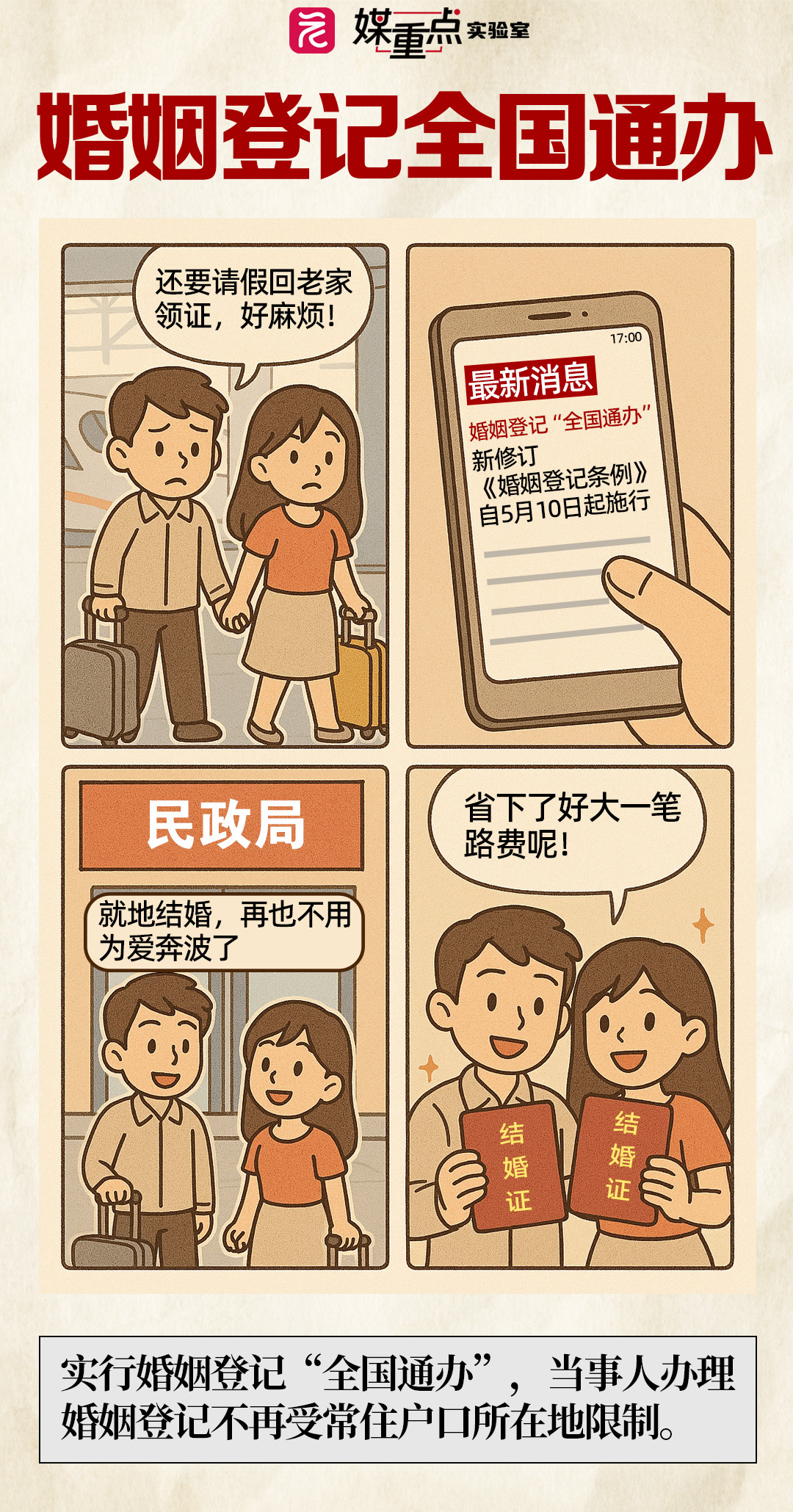 新修订的《婚姻登记条例》自5月10日起施行。“领证不用回老家了”“领证不再需要户口本了”……都将成为现实。