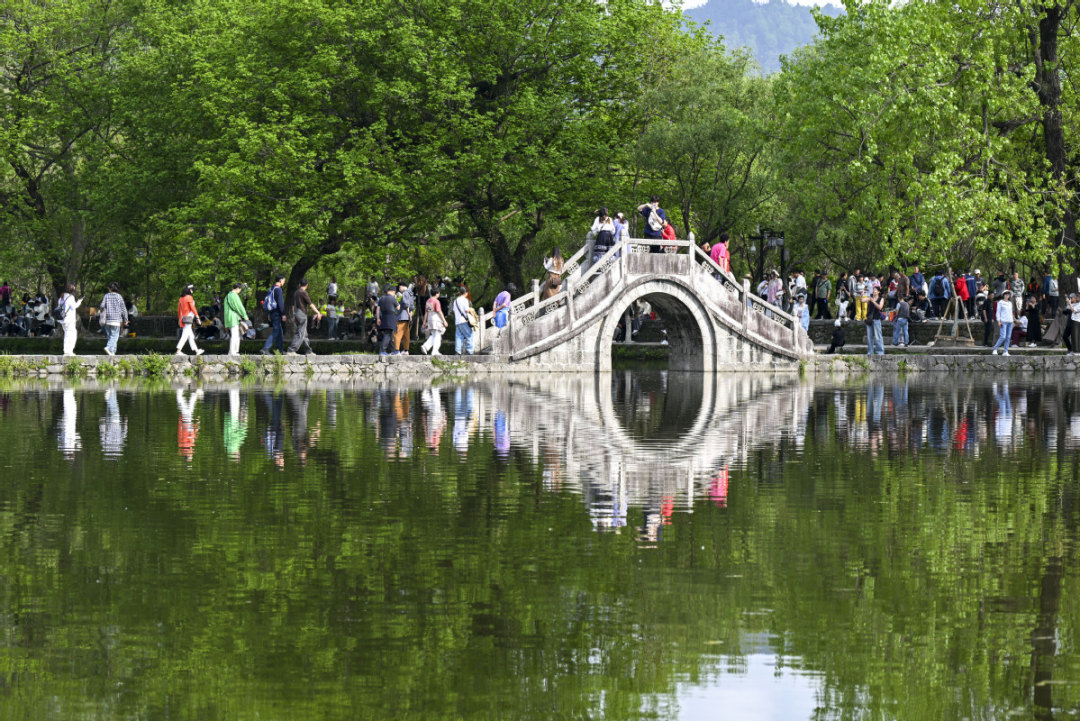 Tourists enjoy the scenery in Hongcun village of Yixian county, Huangshan city, East China's Anhui province, April 17, 2025. [Photo/Xinhua]
