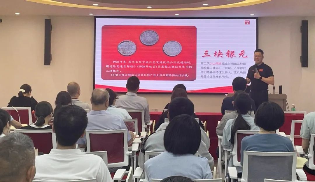 宣讲中,邹广敦以“一盏明灯、三块银元、七位烈士”等伯公凹的传奇革命故事为主线,讲述了邹氏家族先烈为守护中央红色交通线,前赴后继运送物资、传递情报、护送党的重要领导人穿越险境、安全抵达苏区的感人事迹。这些鲜为人知的家族往事,生动再现了革命年代共产党人的坚定信仰与无畏牺牲,展现了红色血脉的赓续传承。