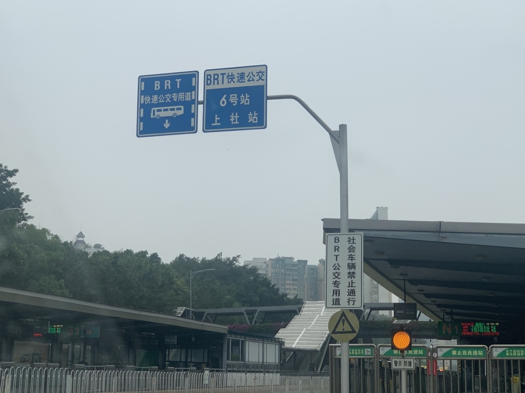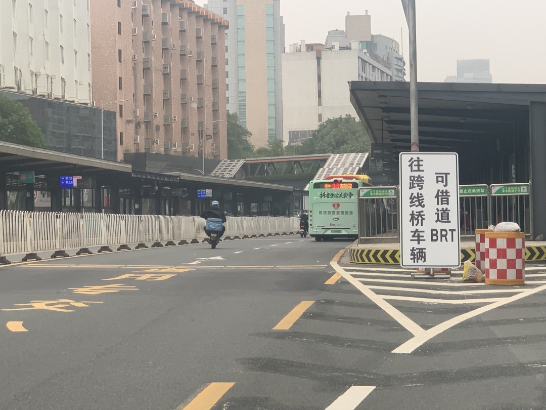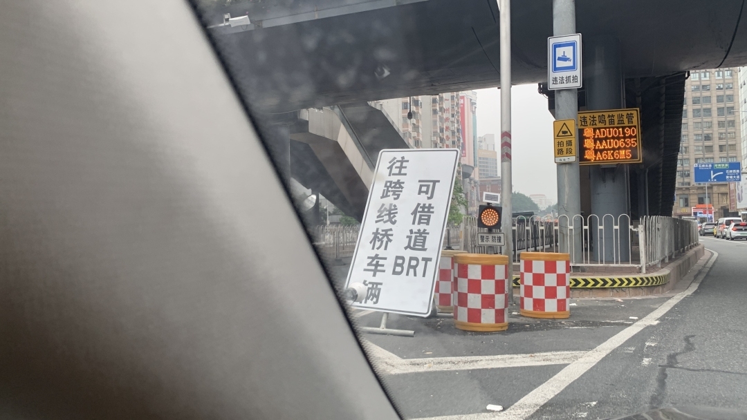 在BRT岗顶段西往东方向入口处,竖立了一块2米高的告示牌,白底黑字写有“往跨线桥车辆可借道BRT”,现场有交警指挥交通。该跨线桥是指连接天河路和中山大道西的一段高架桥,直通BRT师大暨大段。