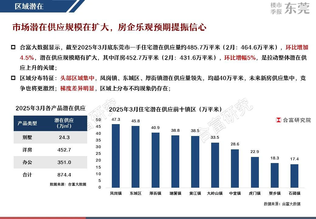 截至三月底,东莞一手住宅潜在供应量为485.7万㎡,环比增加4.5%,潜在供应规模略有扩大。其中,凤岗、东城、厚街潜在供应量领先,未来新房供应集中,竞争也将更激烈,且区域分布不均现象仍然存在。