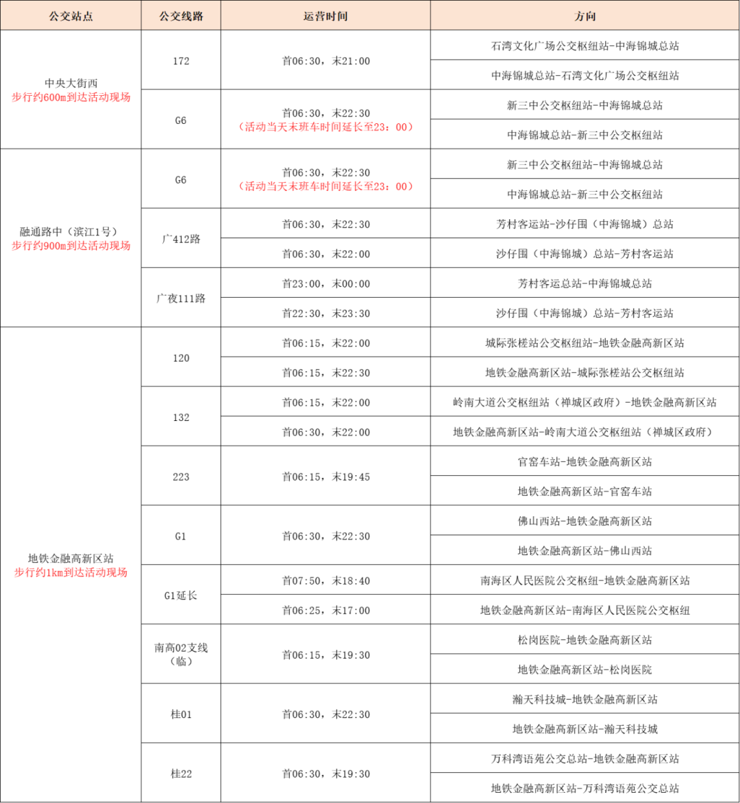 交警部门提醒。活动期间,请途经车辆尽量绕行。避免加剧周边道路交通拥堵。建议市民尽量选择公共交通,错峰绿色低碳出行。市民可通过广佛线金融高新区站A出口步行1公里到达活动现场。活动结束后,在音乐秀场东侧出口离场,并选择乘坐地铁离开的观众,可沿宝翠北路南行往地铁金融公园方向,经公园进入金融高新区地铁站后离开。