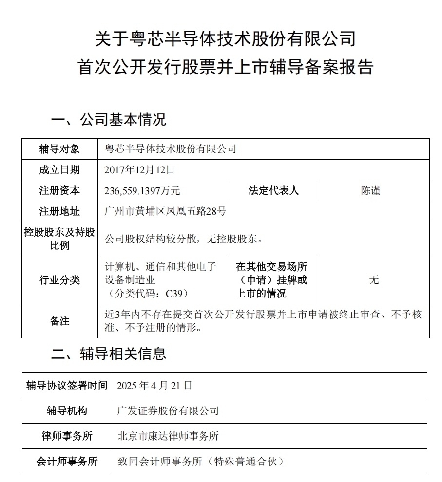 2025年4月25日,证监会IPO辅导公示系统显示,粤芯半导体技术股份有限公司(以下简称“粤芯半导体”)向广东证监局提交IPO辅导备案,正式启动A股上市进程,辅导机构为广发证券。这将是广东全力打造中国集成电路“第三极”的标志性事件。