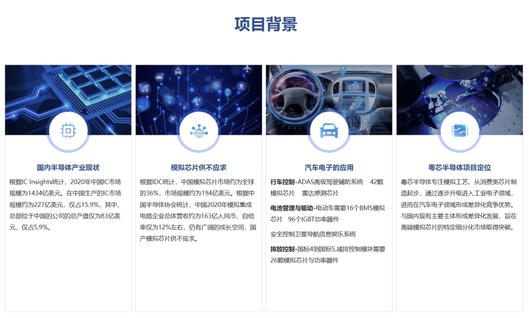 从消费类芯片制造起步,粤芯半导体通过逐步升级进入工业电子领域,进而在汽车电子领域形成差异化竞争优势,致力于未来在高端模拟芯片的特定细分化市场取得突破。目前,企业专注于物联网、汽车电子、工业控制、5G等应用领域。粤芯半导体项目计划分为三期进行,三期建设全部完成投产后,将实现月产近8万片12 英寸晶圆的高端模拟芯片制造产能规模。