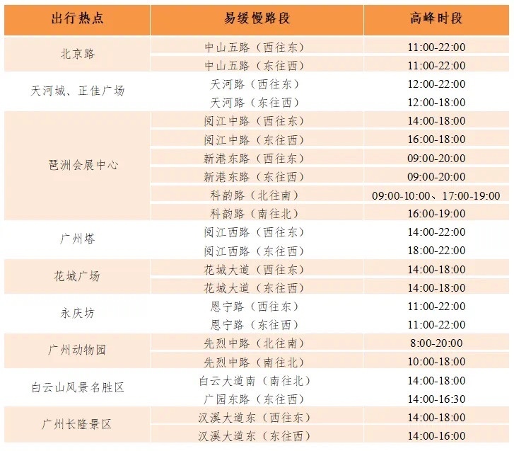 假期期间,中心城区交通总体处于“基本畅通”至“轻度拥堵”状态,商务出行、休闲娱乐出行有所增多。热点区域集中在北京路、天河城等热门商圈,广州塔、永庆坊、白云山、动物园、广州长隆景区、花都融创乐园等热门景点,出行高峰多在10时-12时、14时-18时。