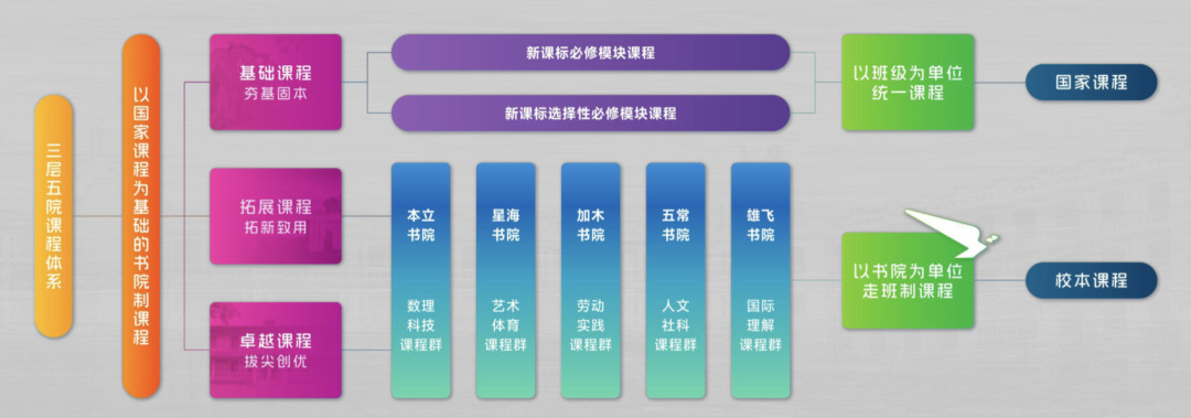 据悉,“三层五院”课程体系是指在执行国家基础课程的基础上,立足高中学生核心素养发展,构建完备的基础、拓展和卓越三层梯级课程体系;建立以国家课程为基础的书院制课程,成立本立书院、星海书院、加木书院、雄飞书院、五常书院五大书院,分别聚焦数理技术、体育艺术、劳动实践、人文社科、国际理解。