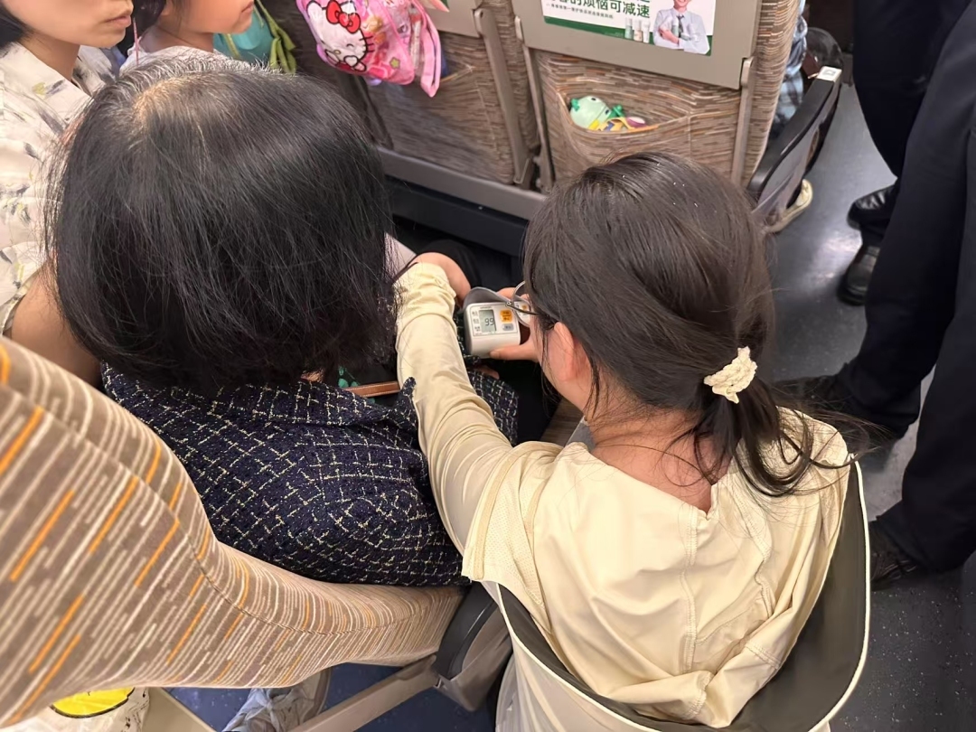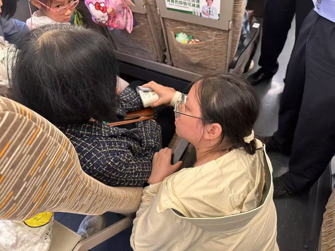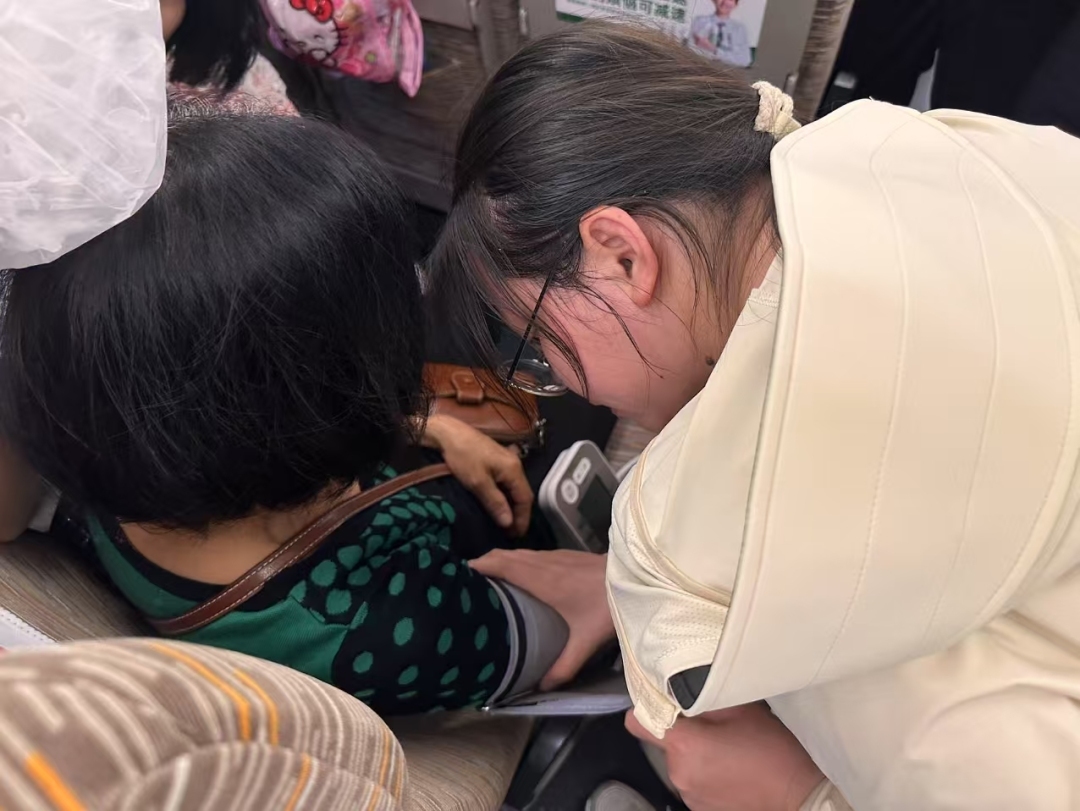 4月27日下午,从武汉到广州的高铁列车行进途中,佛山市第三中学高二年级研学队伍随行校医闵秀润刚检查完身体不适的学生状况,就听到列车长寻求医护帮助的广播,一名老年乘客因行李架上的行李箱意外滑落被砸中头顶,疼痛不已。闵秀润把刚拿到手的晚餐放到桌面,迅速赶到现场。