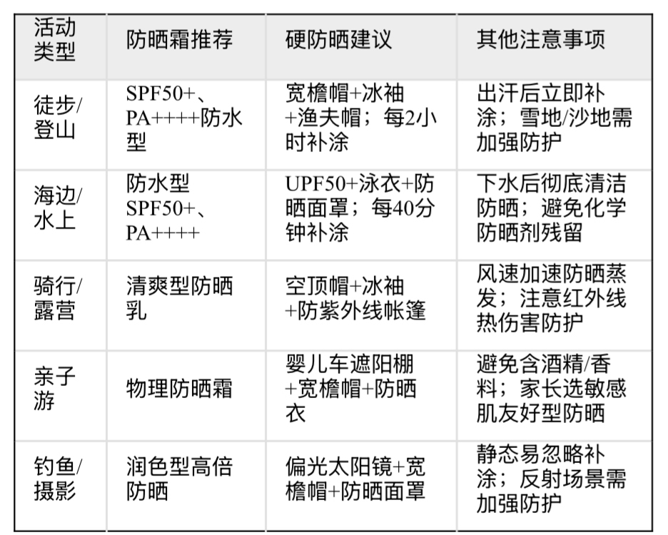 特殊场景:高原/雪山需SPF100+;海边/水上活动需防水型。