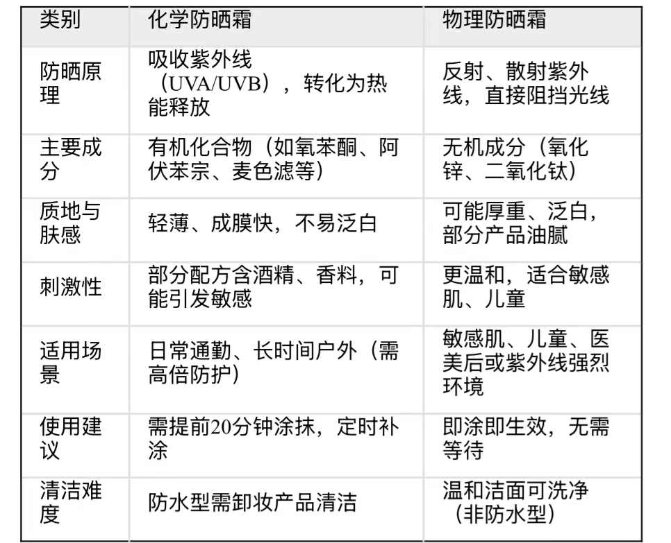 敏感肌:纯物理防晒霜(氧化锌/二氧化钛,无香精酒精)。