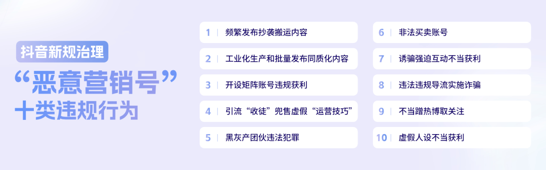 早在今年1月,抖音宣布拟推出10项措施,切实推动平台工作透明化,创建安全与信任的平台环境,打造更良好的网络生态。其中就包括加大对“恶意营销号”的处置力度。本次《规范》发布也是相应措施的进一步落地。