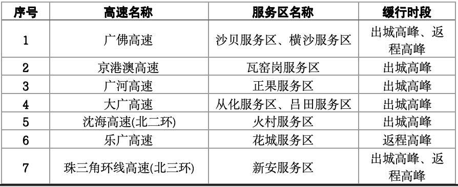 节假日期间,广佛高速沙贝服务区、横沙服务区,京港澳高速瓦窑岗服务区、广河高速正果服务区、大广高速从化服务区及吕田服务区、沈海高速(北二环)火村服务区、乐广高速花城服务区、珠三角环线高速(北三环)新安服务区会比较繁忙,车流量密集,进入服务区排队时间较长,排队长度甚至影响主线通行。