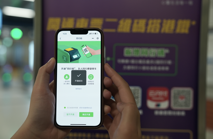 具体操作是,内地游客在香港乘坐港铁时,只需在微信中搜索“搭车码”小程序,将地区切换至香港,即可在相关小程序页面开通“同行码”功能;或在内地“乘车码”小程序中进行同样的地区切换,快速启用“同行码”服务。开通后,即可生成最多两名同行者的港铁“同行码”,实现使用同一手机最多三人刷码进出车站,大幅提升出行效率,让一家老小出游也能畅行无阻。