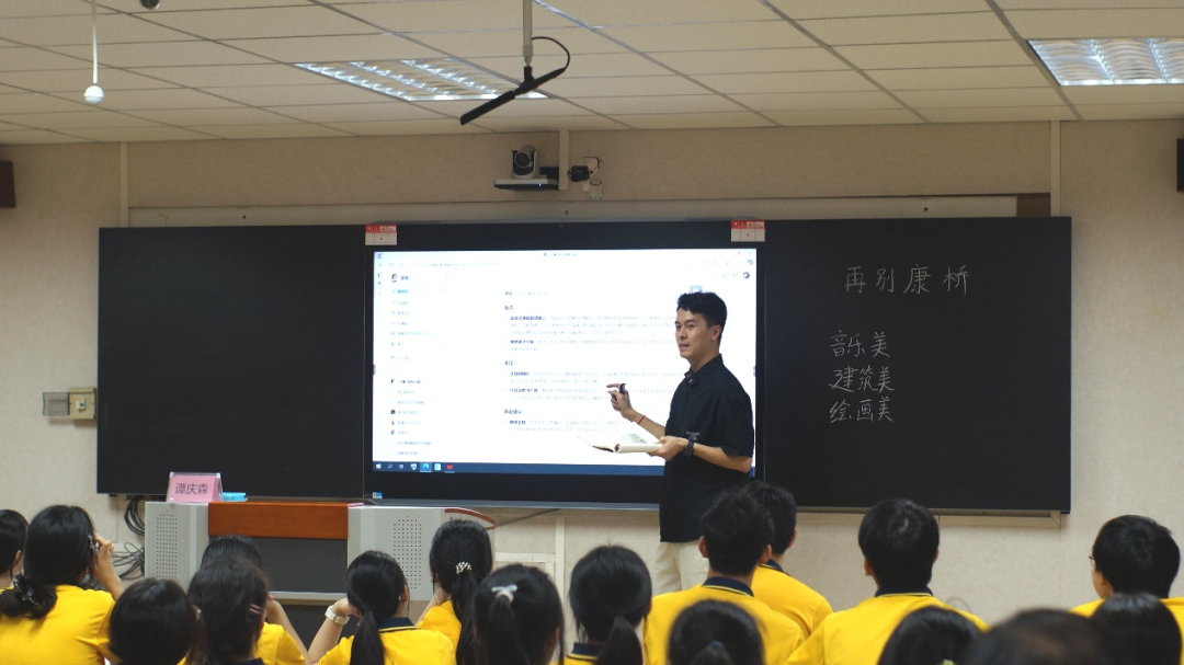 在研讨会的课例展示环节中,广东第二师范学院实验中学教育集团的谭庆森老师带领学生走进徐志摩的《再别康桥》。他借助智慧教育平台的丰富资源,引导学生从多个角度欣赏诗歌的韵律美、意象美和情感美。