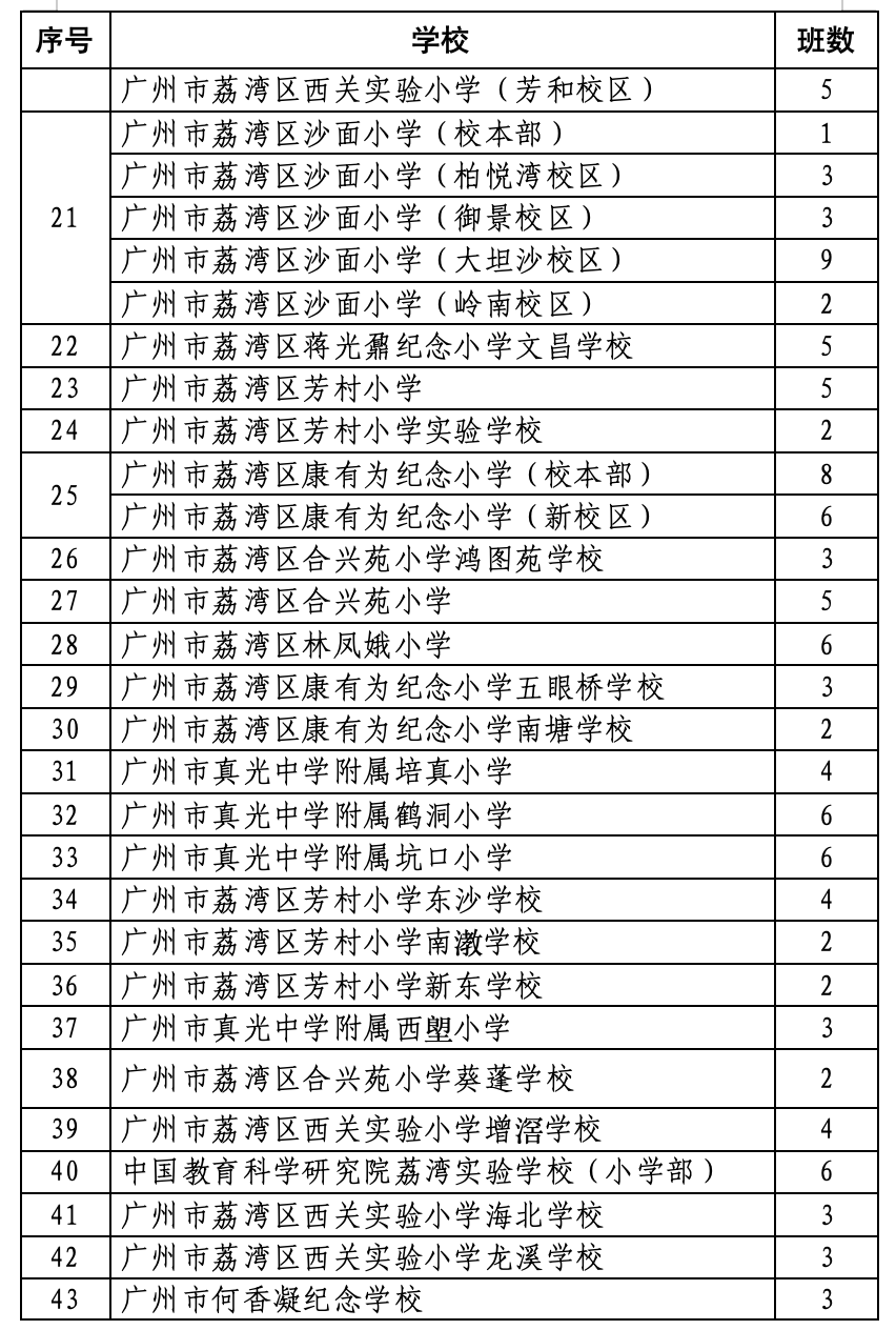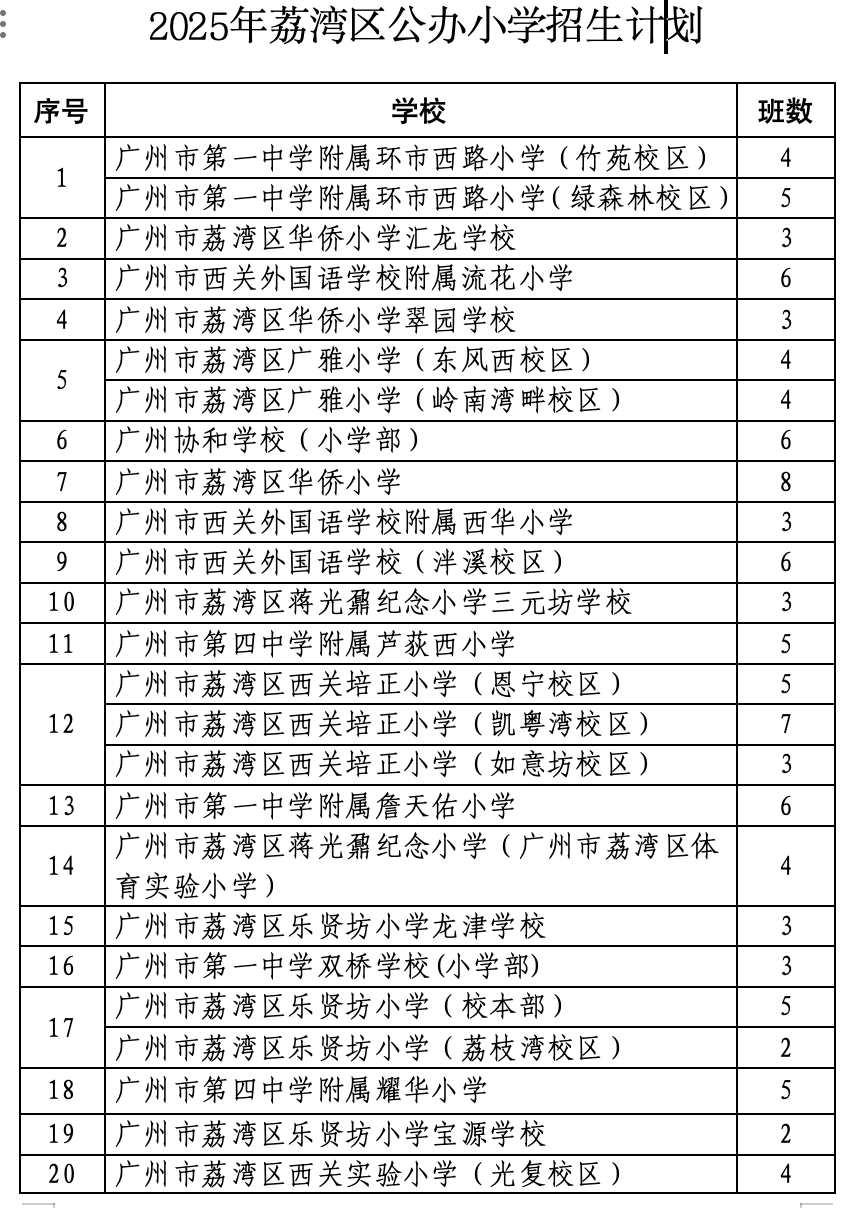 4月28日,广州市荔湾区教育局公布“2025年广州市荔湾区公办小学一年级招生工作方案”,“2025年荔湾区公办小学招生计划”同步发布。具体如下: