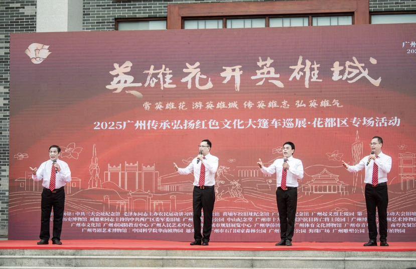 活动伊始,“英雄花开英雄城”2025广州传承弘扬红色文化大篷车旗帜传递至花都区。随后,来自各界的优秀宣讲员带来了一场生动的“英雄故事会”。孙中山大元帅府纪念馆的讲解员张静芸以《一座桥梁的华人故事——刘恩华与“海珠桥”横幅》为题,讲述了桥上镶刻的“海珠桥”三个大字的由来,展现了海外华人的爱国情怀。来自广州博物馆的讲解员何文涛讲述了抗英名将陈连升的战马被捕后绝食自杀殉国的传奇故事,弘扬了不屈不挠的民族精神。来自广州出入境边防检查总站轮训大队的民警王文渊讲述了边检警察捍卫国家安全、维护口岸稳定的感人故事。