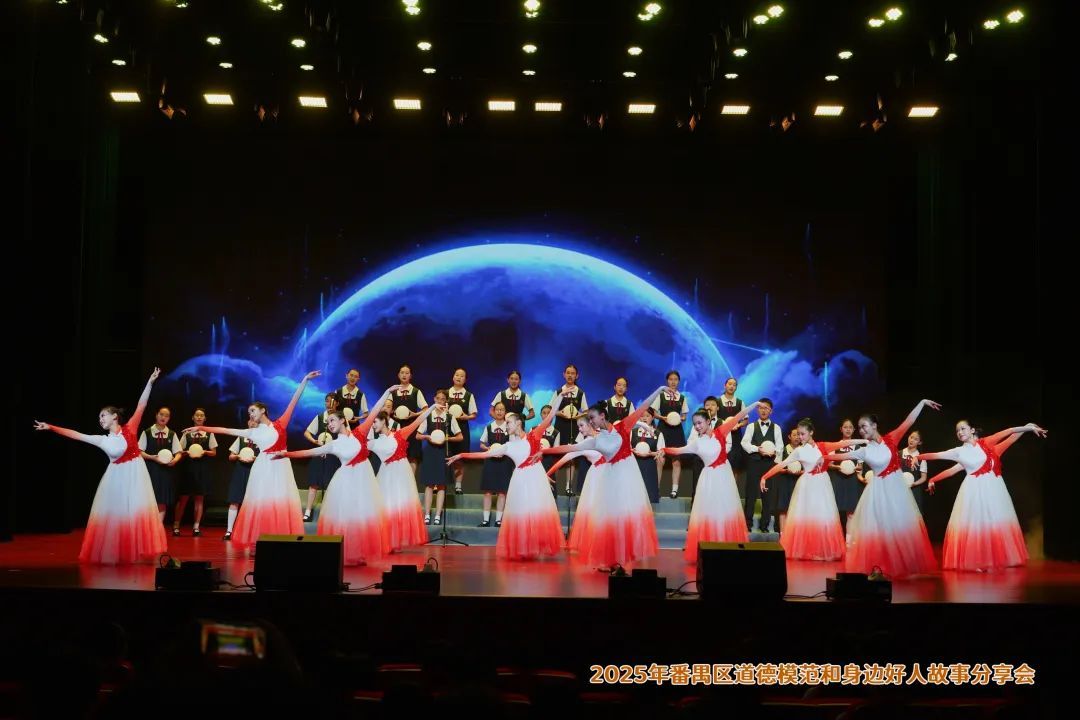活动在番禺区市桥东风中学的歌舞《奉献》中拉开帷幕,少儿合唱与舞蹈的完美交融,映衬出道德模范手捧鲜花登台的动人画面。