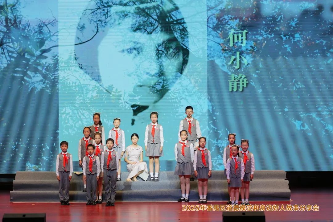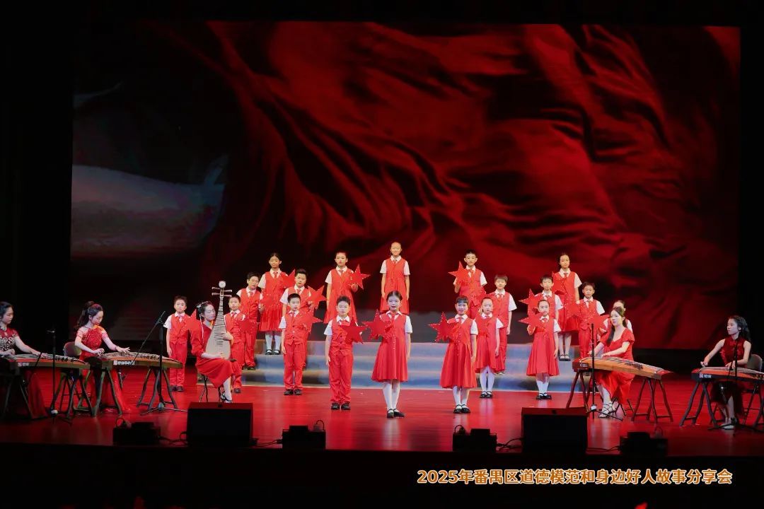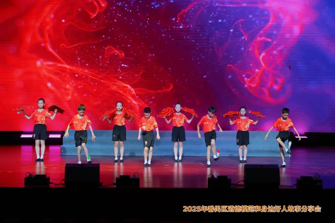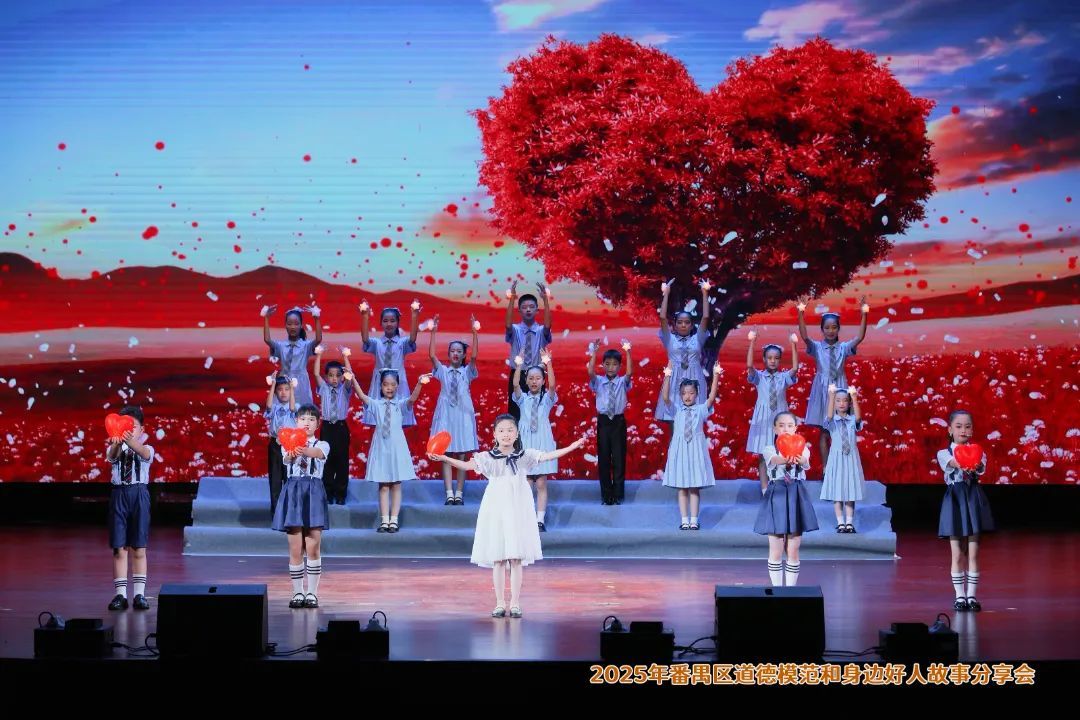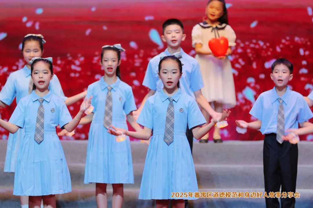 在广东番禺中学教育集团培兰小学的手指舞合唱《听我说谢谢你》中,助人为乐、见义勇为、敬业奉献、诚实守信、孝老爱亲五类身边好人代表逐一登台分享心声,一句“帮助他人,是我最大的幸福”引发全场共鸣。