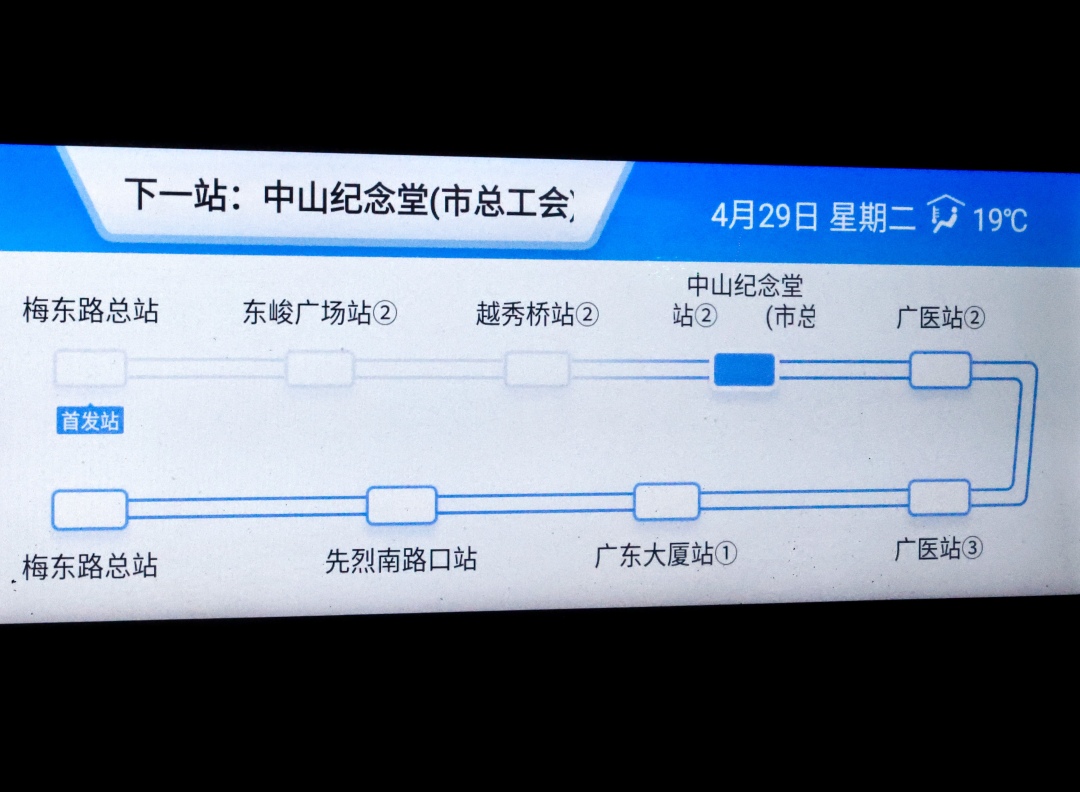 记者乘车体验,车辆行驶过程中会对线路附近的广州动物园、中山纪念堂等景点进行介绍,车内屏幕还会显示车速、车辆轨迹。记者看到,车内最高车速可达到36km/h。
