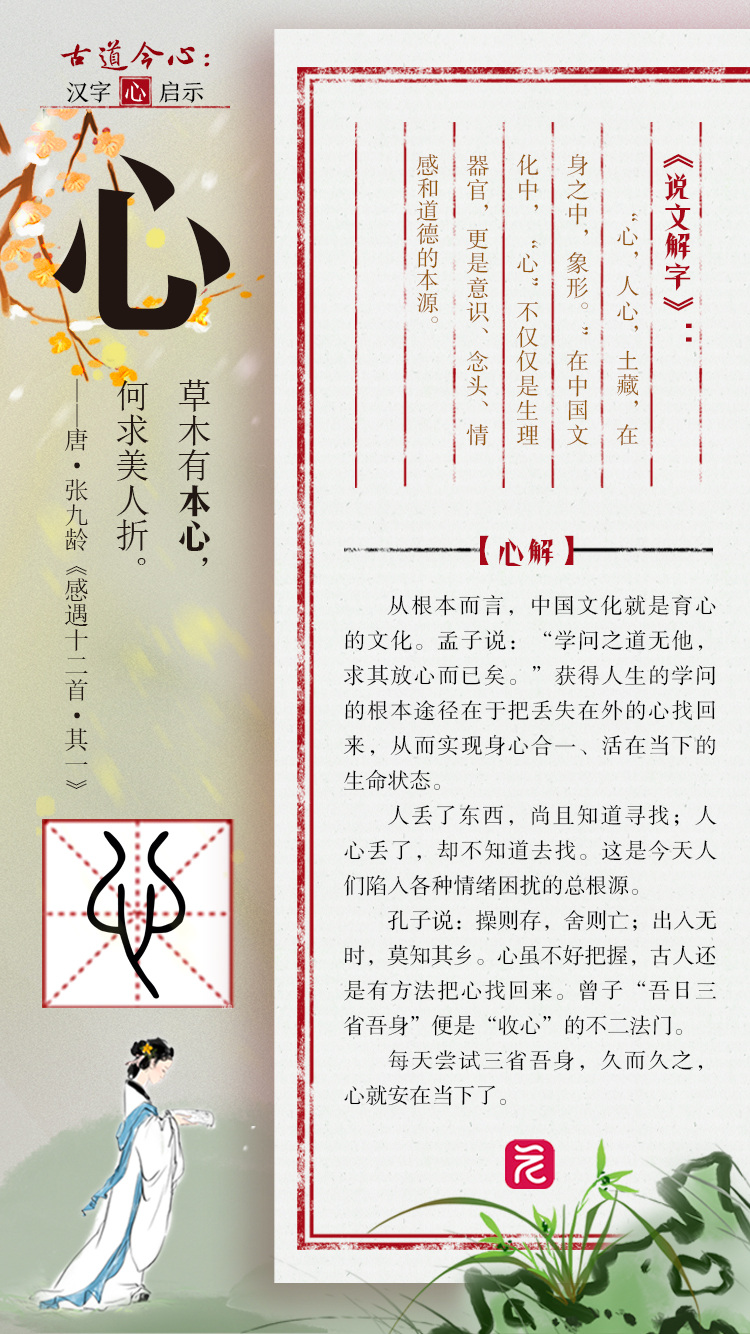 养心志,育情操。广州日报推出《汉字“心”启示》系列海报,从《说文解字》入手,选取部分“心”部首汉字,结合现代心理学研究进行解读,联通古今,探寻汉字里的“心”启示、“心”方法。