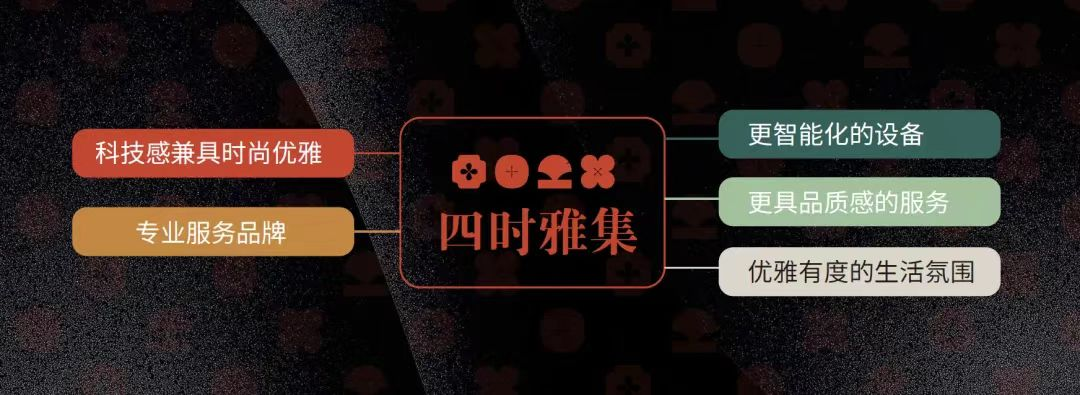 “四时雅集”这一品牌以“雅集生活,智由心生”为品牌理念,通过“安全、便捷、优雅、知交”四个维度,倾力打造了科技感兼具时尚优雅的专业服务品牌。为客户营造“雅致知交”的生活氛围,以典雅知性服务丰富社区精神领域。