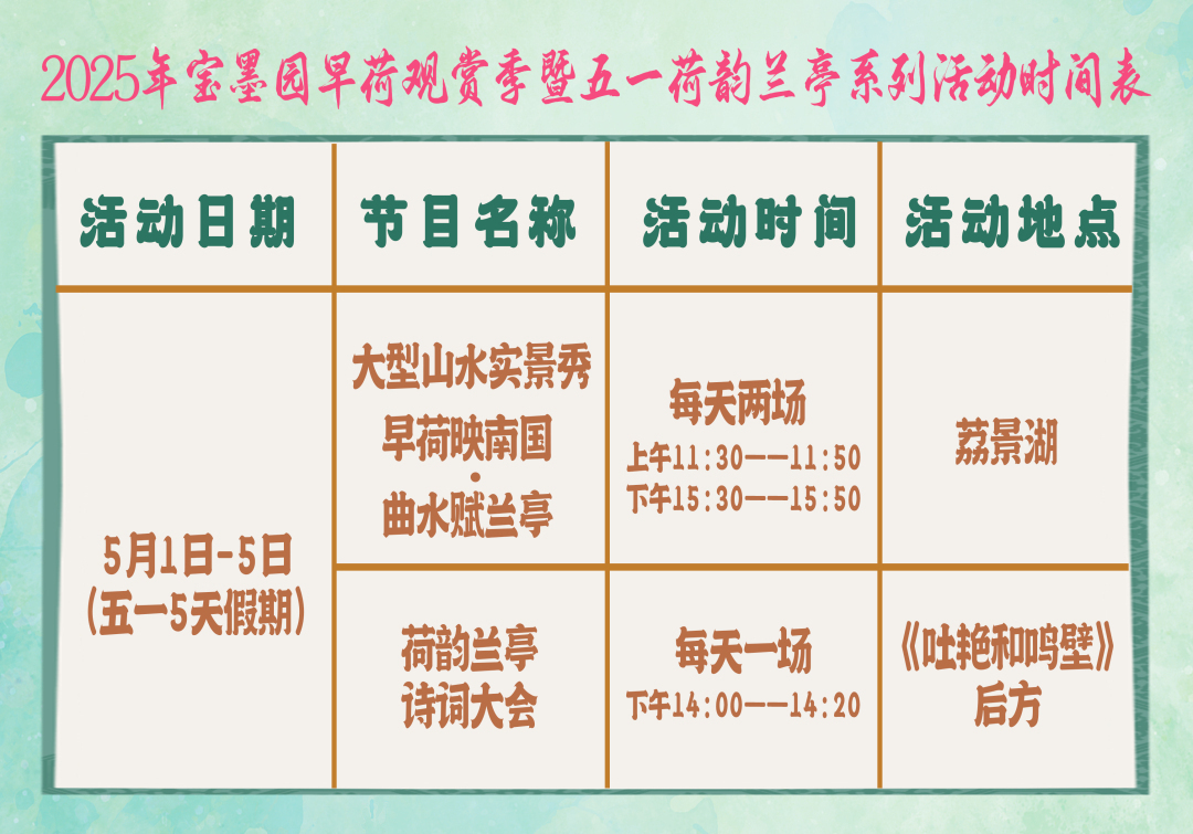 5月1日至5日,宝墨园将以“早荷映南国 曲水赋兰亭”为主题,推出早荷观赏季暨“五一”荷韵兰亭系列活动,首波早荷绽放的时令美景与人文雅韵深度融合,通过每日两场大型山水实景秀、诗词文化互动体验等创新形式,为游客打造集视觉盛宴与文化传承于一体的荷韵盛会。