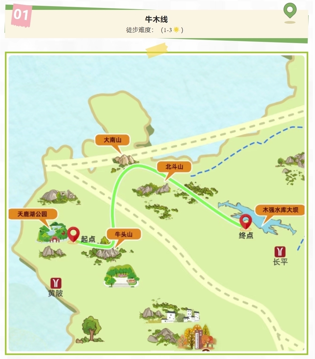 牛木线是一条知名度极高的广州经典户外徒步路线,全程约16公里。起点位于天鹿南路联和墟公交站,终点为木强水库大坝。由于线路风景秀丽、地貌丰富,徒步过程中可以穿越灌木丛、竹林、芭蕉林、乱石坡等自然景观,感受极具野趣的户外体验。