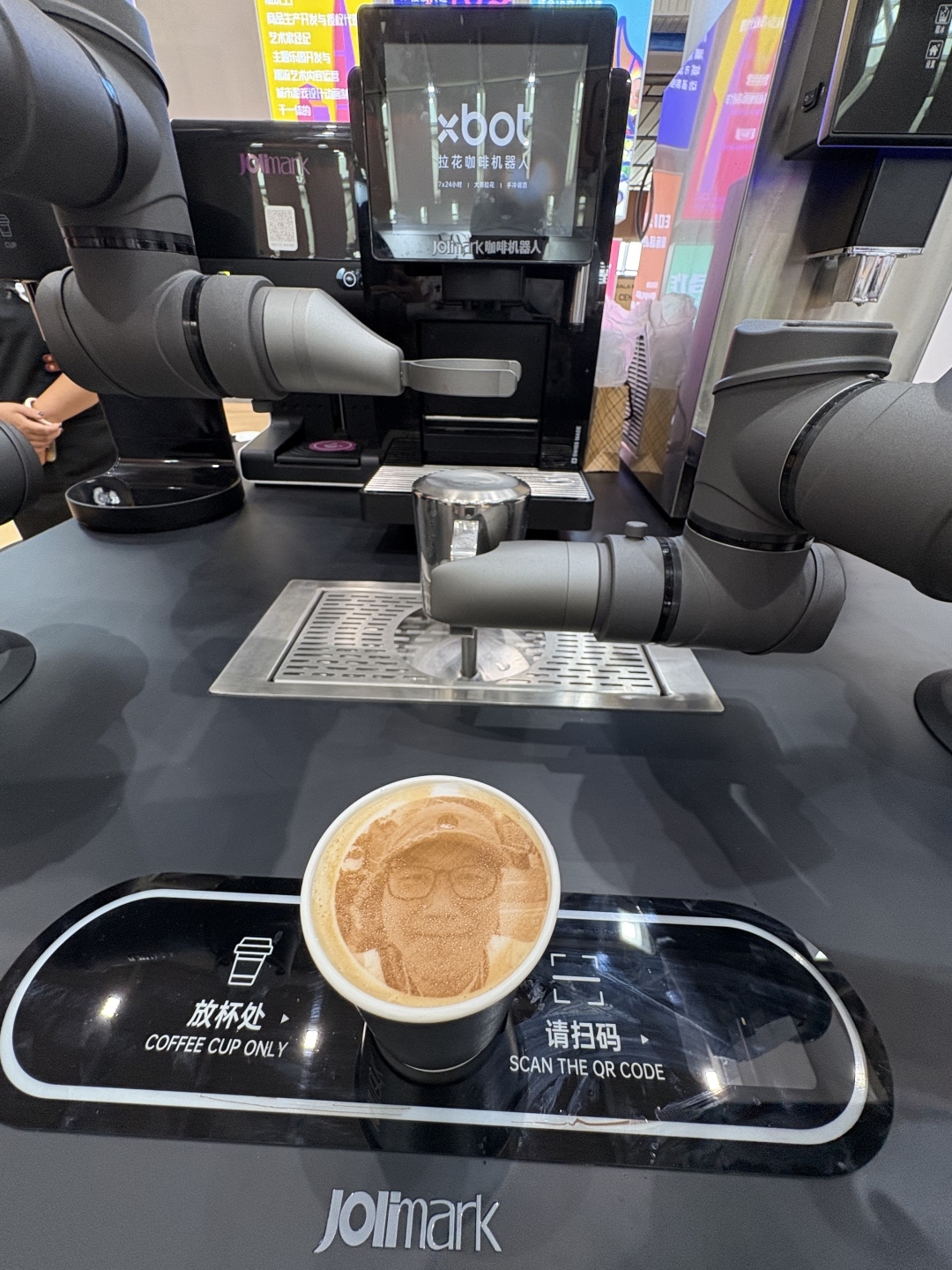 有趣的是,在这里还能找到新奇的喝咖啡姿势。现场,一款机器人制作咖啡的“神器”吸引不少观众“围观”。
