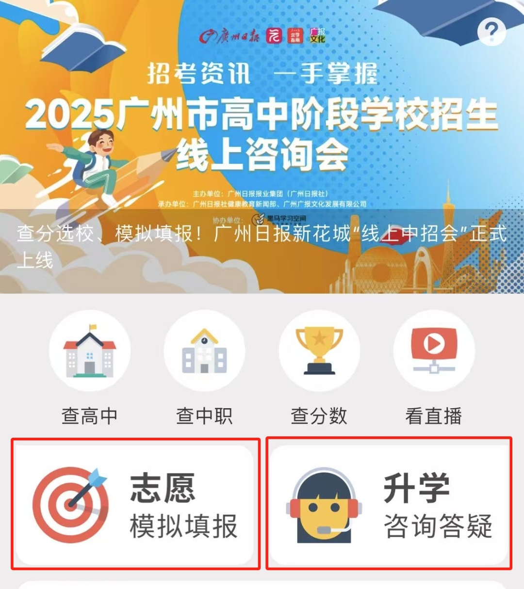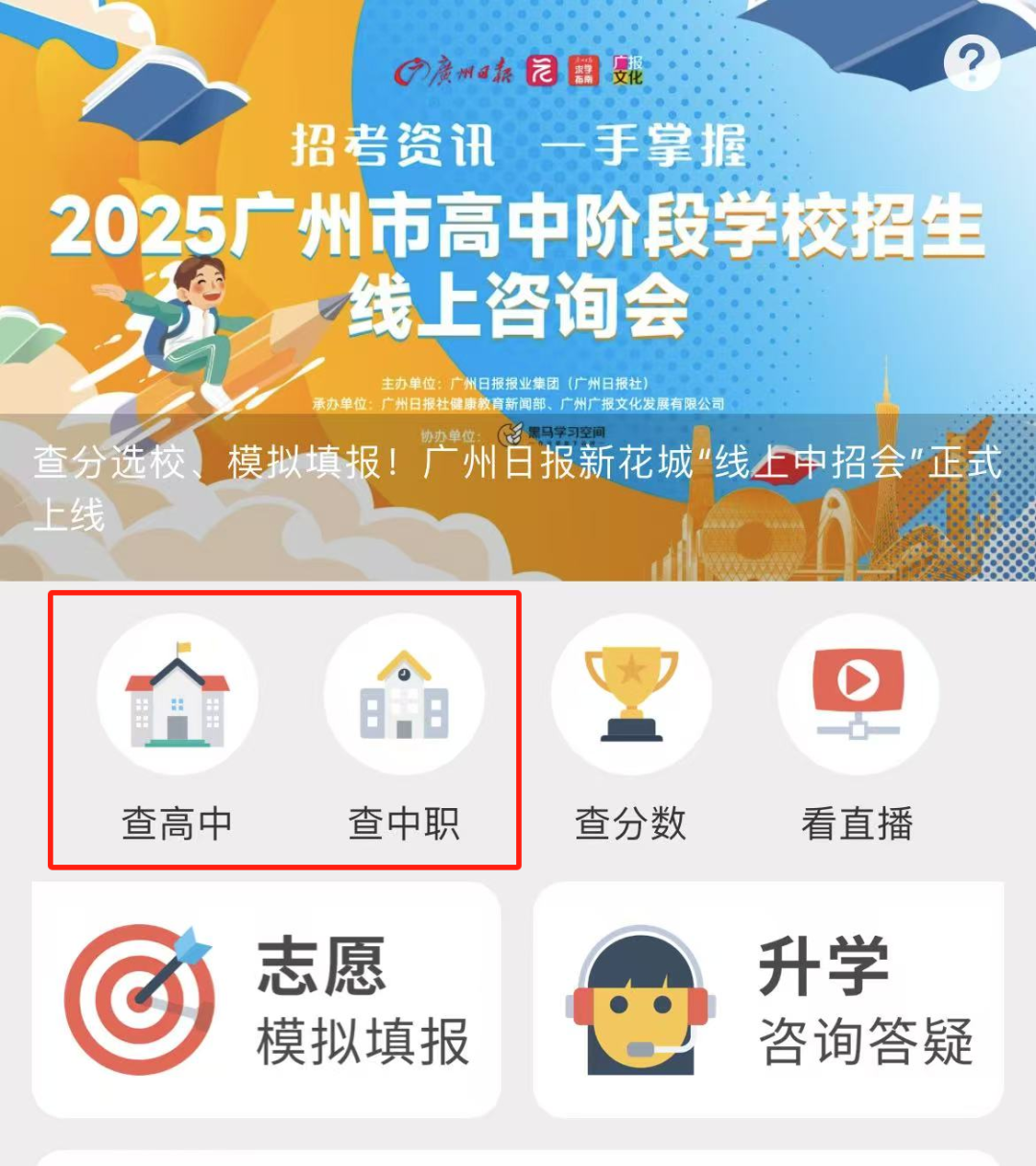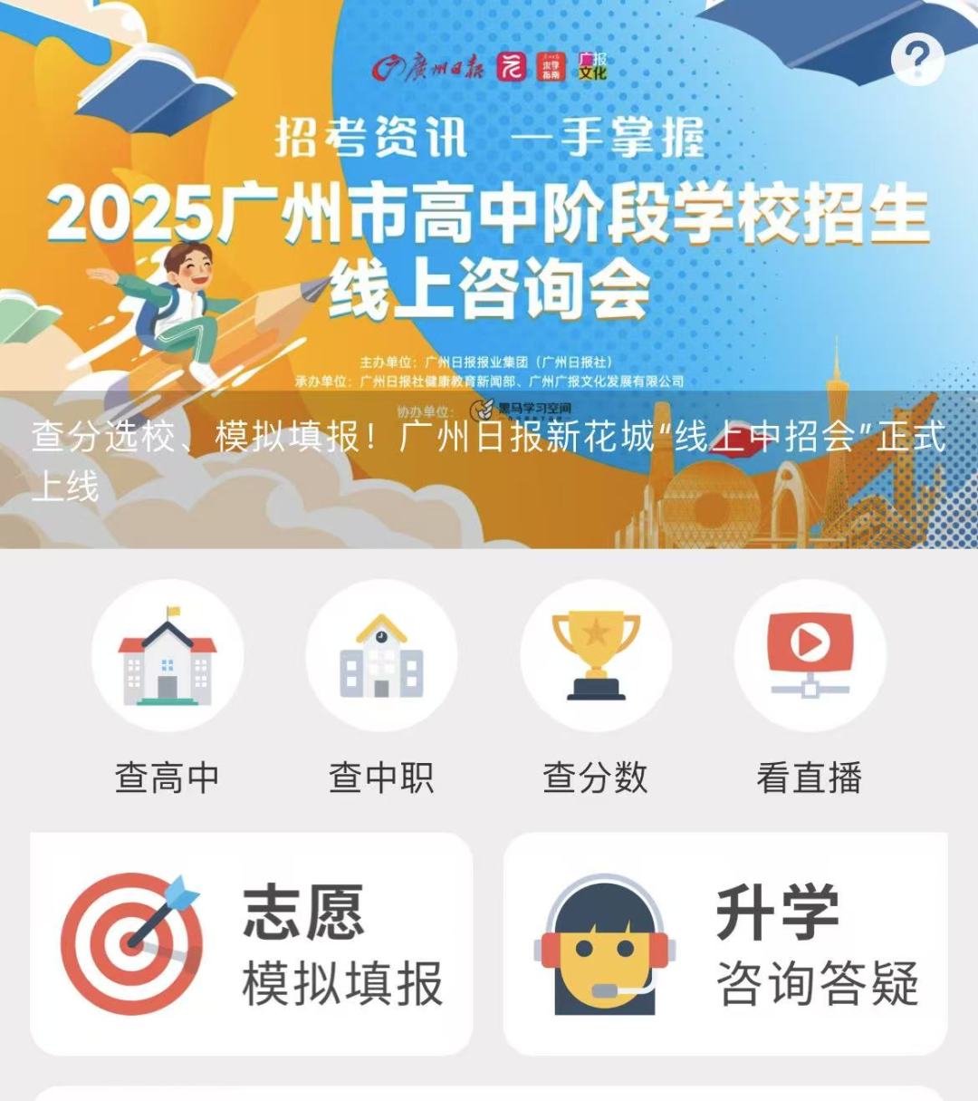 1.广州日报新花城客户端:首页点击“线上中招会”专题图,或通过“服务→推荐服务”进入。