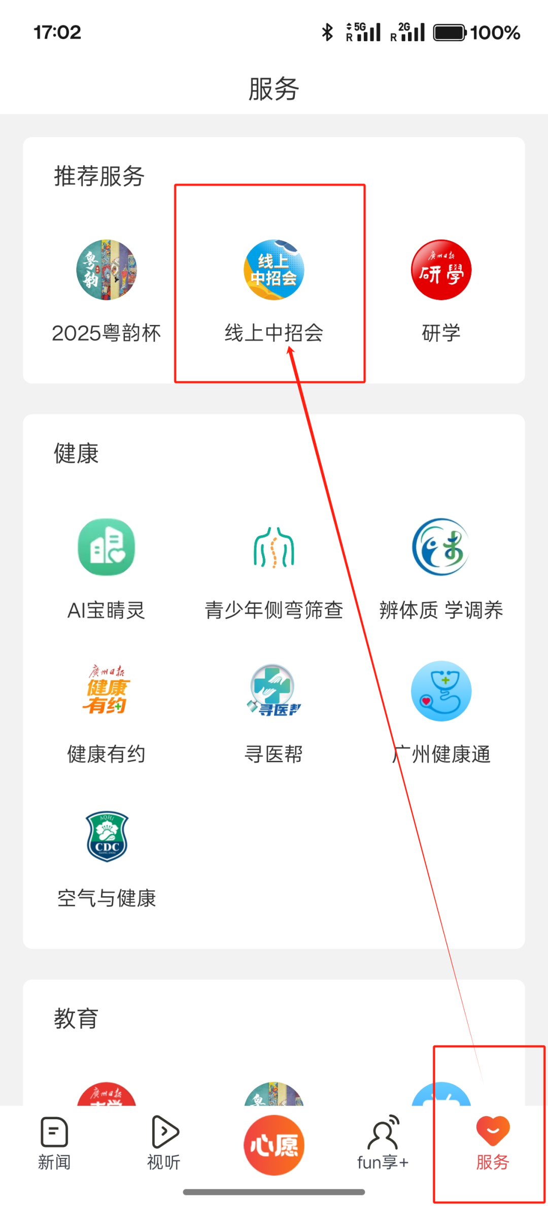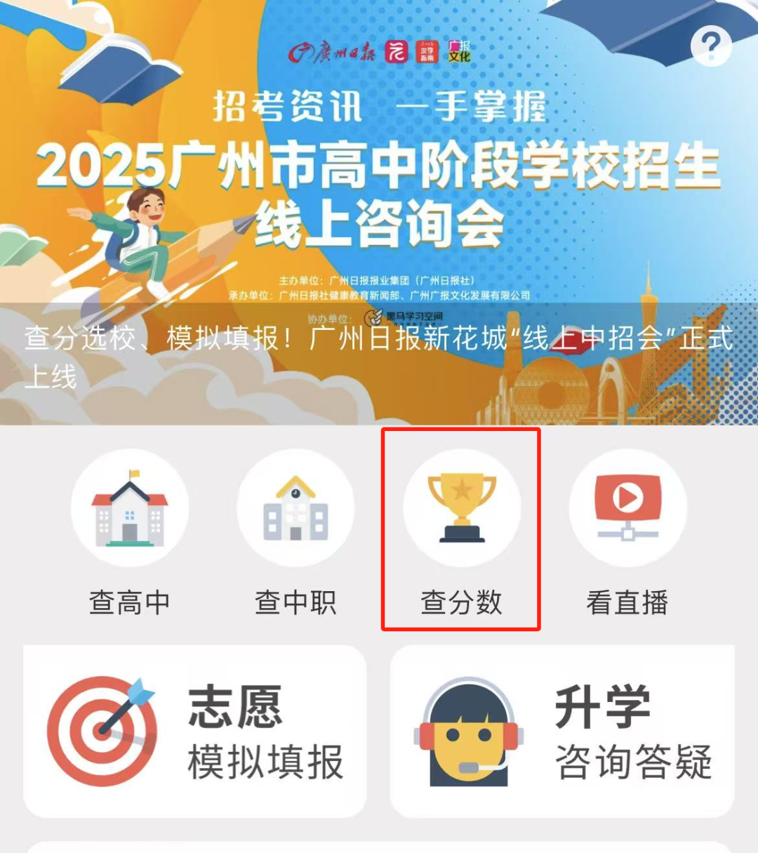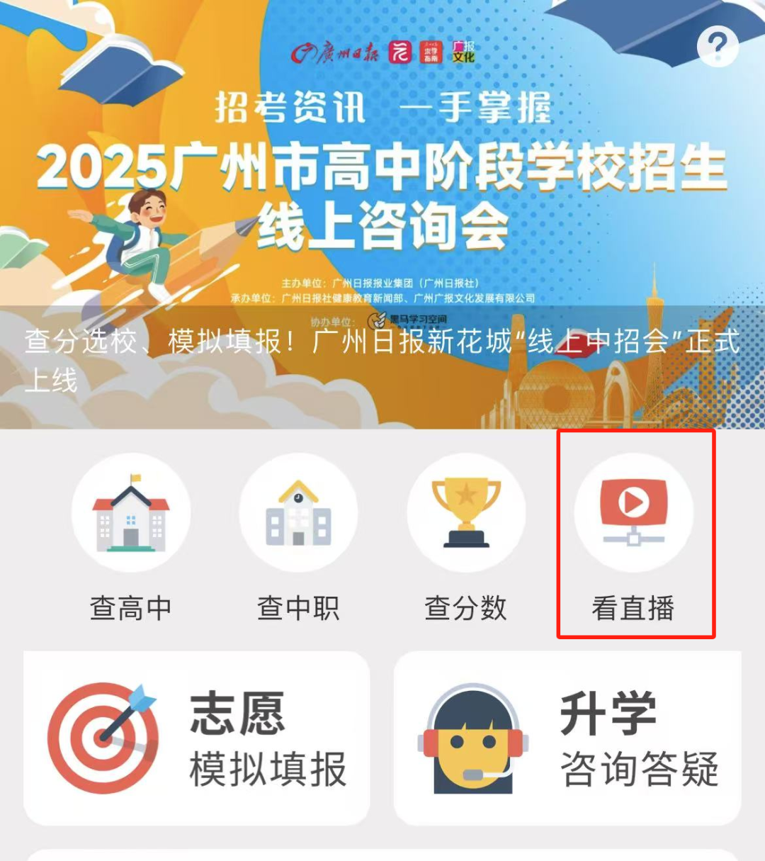 1.广州日报新花城客户端:首页点击“线上中招会”专题图,或通过“服务→推荐服务”进入。