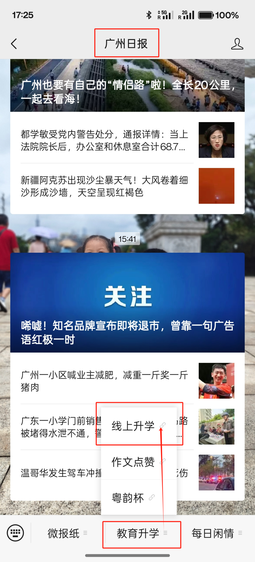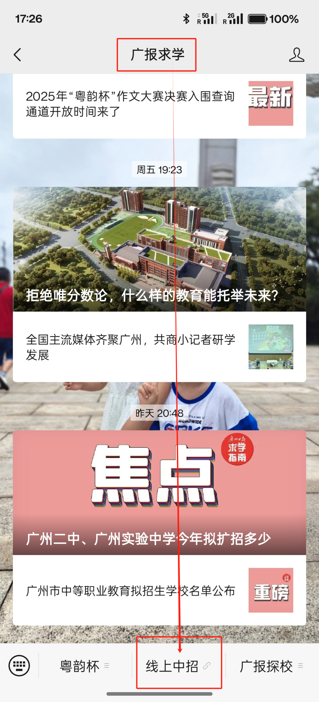2.微信公众号:关注【广州日报】或【广报求学】,菜单栏一键直达。