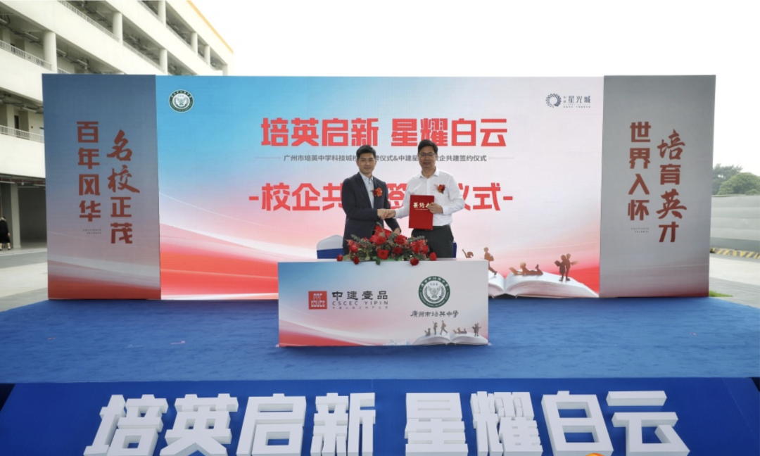 仪式上,中建壹品投资公司南方分公司与广州培英教育集团签署了校企共建协议,双方将在校园建设、教学资源共享等方面展开全方位合作,切实为社区居民提供优质的教育资源。