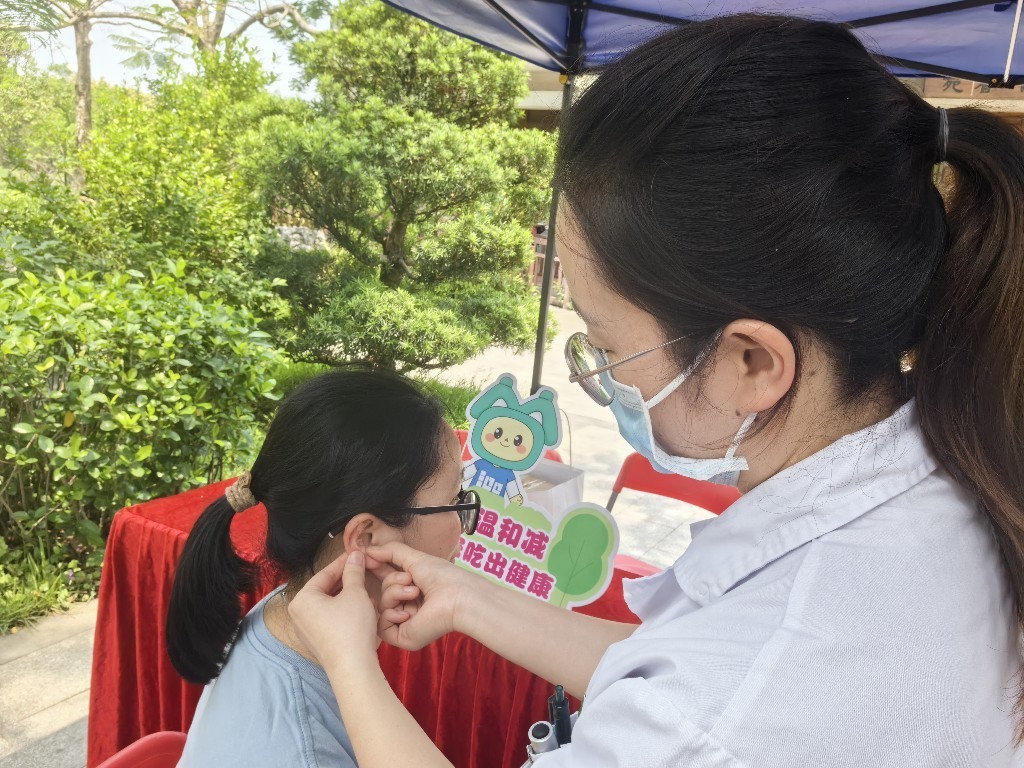 活动现场,海珠区疾病预防控制中心摊位开展了体重管理科普宣传活动。工作人员通过趣味十足的“BMI大转盘”互动工具,帮助居民快速测算体质指数(BMI),现场解读体重状况评估结果。这种直观易懂的方式让居民们轻松掌握“肥胖”“超重”“正常体重”等健康概念,认识到科学管理体重对健康的重要性,吸引了众多居民参与。南洲街社区卫生服务中心设立中医体重管理摊位,“中医减重进社区”项目秉持“整体调理、内外兼修”理念,内调外治结合,通过耳穴压豆、穴位埋线等特色技术,为居民提供个性化方案,实现“瘦身不伤身,减重更重康”,推动中医“防-治-管”服务下沉。