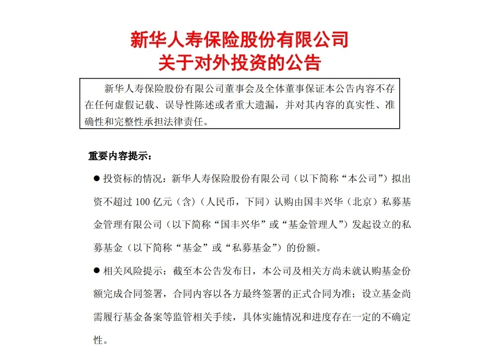 新华保险公告显示,为积极响应国家推动中长期资金入市的政策理念,贯彻长期投资理念,通过低频交易、长期持有的方式以获得稳健股息收益,提升长期投资回报,实现资金保值增值,公司拟出资不超过100亿元认购由国丰兴华发起设立的私募基金的份额。