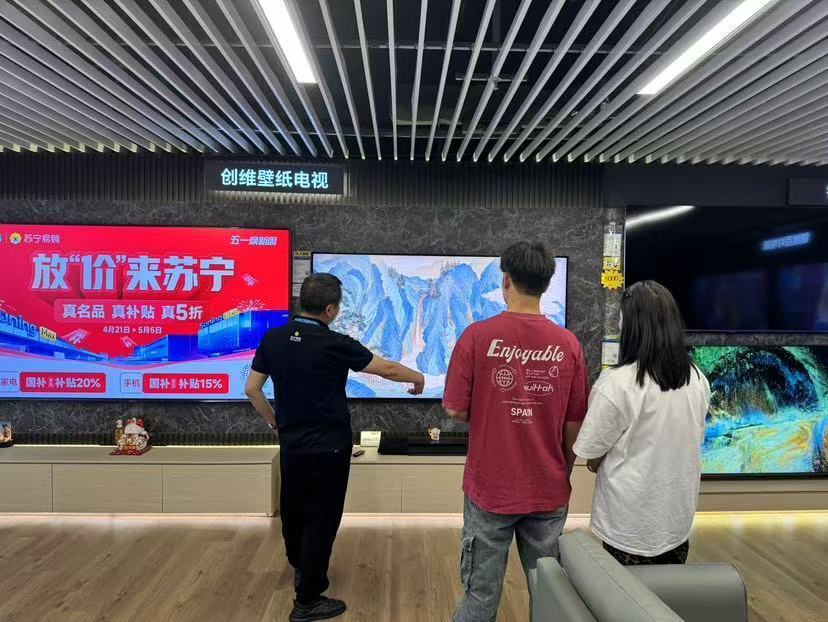 根据广州市目前的“以旧换新”政策,一级能效的电视选择10000元左右最划算,能够享受最高2000元的补贴。“五一”假期是换新电视的好时机,因为选择更加丰富了,其中还有不少新品。某线下家电卖场里就有超30款电视新品首发,比如提供院线级影音体验的百英寸巨幕电视,将电视如壁画般融入墙面、提升家居品位的壁纸电视,如同一位“好看的帮手”,可以修复老照片、定制旅游攻略的治愈系AI电视等,都是换新的热门产品。苏宁易购数据显示,2025年一季度,85英寸及以上大屏彩电销售占比已超五成,AI交互功能成为核心需求。结合相关“以旧换新”政策,电视可享15%~20%的换新补贴,单件商品至高补贴2000元。目前,AI智能电视的高端产品普遍在万元级别,可享最高2000元补贴。