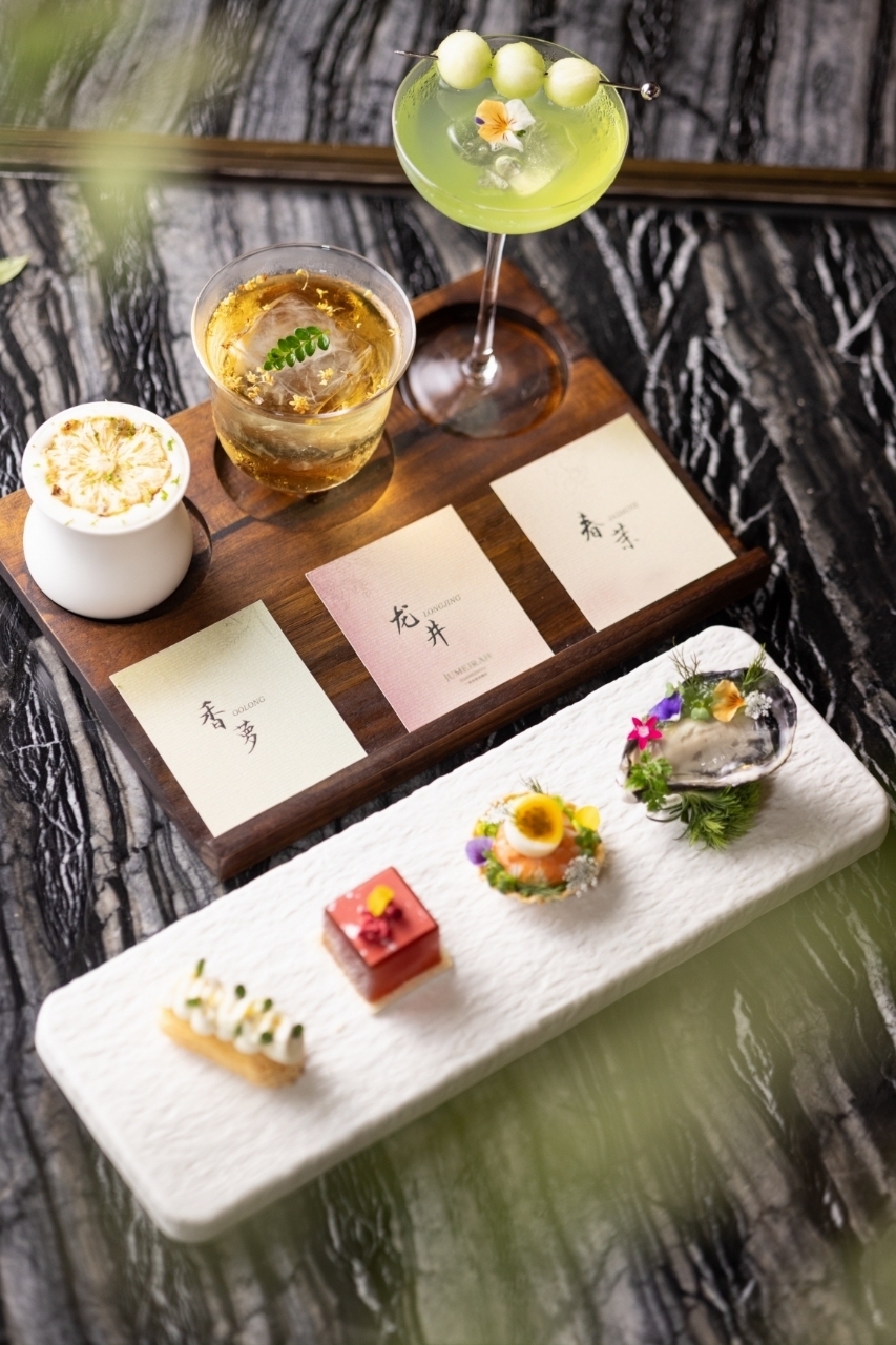 茶点所配之春茶为特调,用茉莉花茶、羊角蜜瓜和苏打水调制而成的“春茉”,清新得很,拂去春日的疲惫;桂花、龙井和清香木凝聚成的“龙井”,桂花如春雨般温柔,香气缭绕。经历8小时冷萃的龙井茶翠绿清新,蕴含春日生机。融化的方冰带来清凉,诉说春日宁静;“香萝”以当季菠萝所带的独特清甜,融合乌龙茶的醇厚和海盐的微咸,清新独特,仿佛春日的阳光,带来自然的馈赠。在大堂酒廊,宾客每日还可品味到新鲜炒制的英德绿茶,这一芽一叶,用古法炒揉,凝萃鲜爽回甘,抿上一口,清澈明亮的汤色,以及淡雅的花香,叫人十分陶醉。