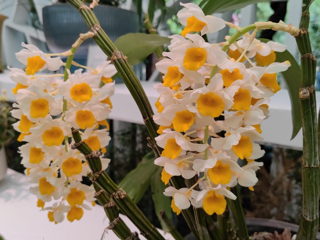 “空谷幽兰”“兰蕨秘境”“兰花小筑”等多个兰花艺术展区同步焕新,百种兰花编织成一幅绚烂多彩的兰花图谱,将为市民游客带来一场“花花盛宴”。其中引进的新品——紫色马卡龙蝴蝶兰极为吸睛,姿态各异的兰花色彩缤纷,与蕨类植物相映成趣。展区还有许多在园艺师精心培育下历经四季更迭的百盆兰株,如鼓槌石斛、香水石斛、泸水兜兰、魔帝兜兰等复花开放的“时光见证者”。
