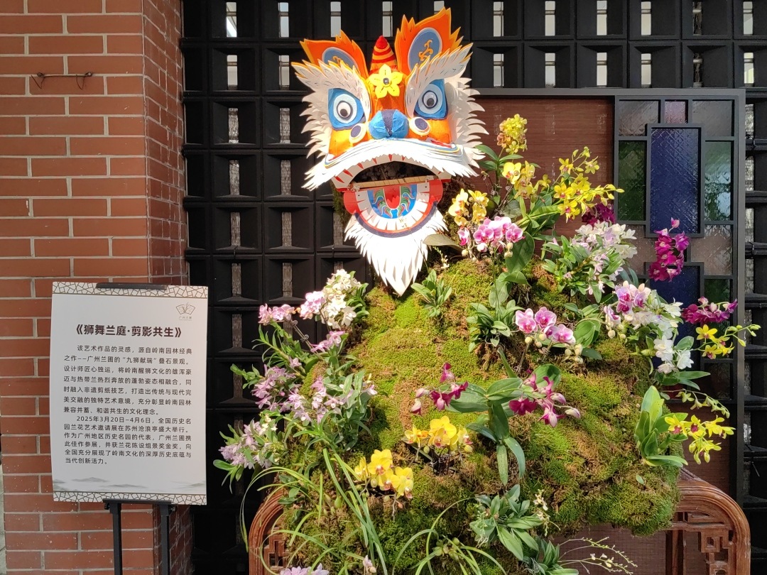 “五一”期间,代表广州兰圃荣获“名园名蕙耀沧浪”2025中国历史名园兰花艺术邀请展兰花陈设组景奖金奖的《狮舞兰庭·剪影共生》载誉而回,让游客一睹金奖风采。该艺术作品以岭南醒狮文化为魂,将千年来传承的雄浑豪迈注入其中。岭南醒狮文化的雄浑豪迈与热带兰热烈奔放的蓬勃姿态相融合,同时融入非遗剪纸技艺,为作品增添了时光的厚度,打造出传统与现代完美交融的独特艺术意境。