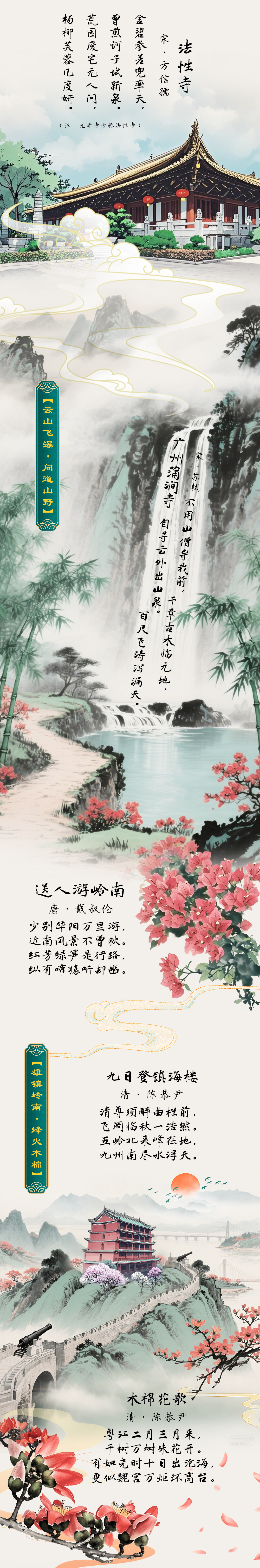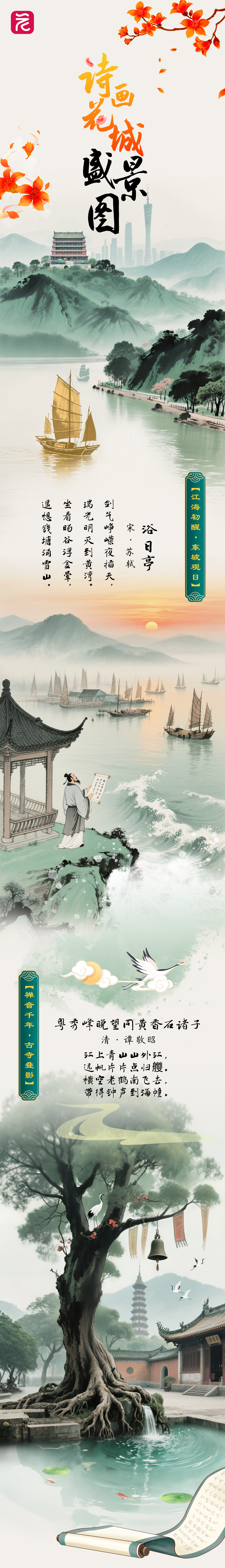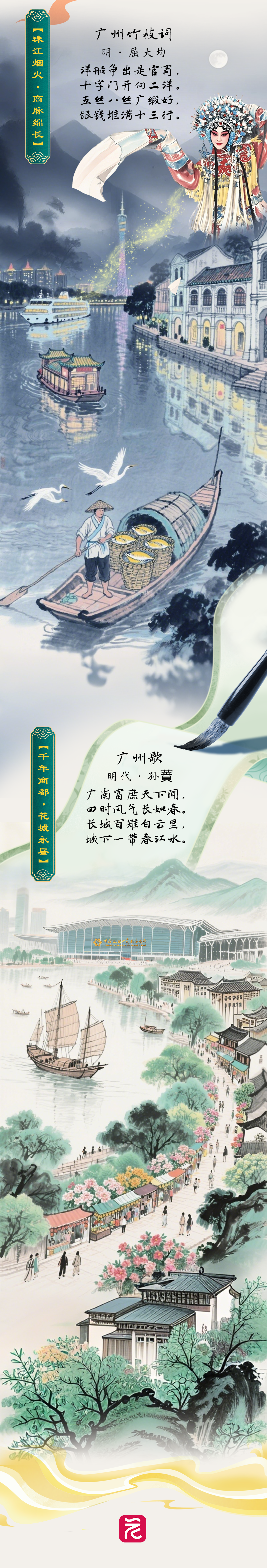 历代文人佳作,见证了广州城市发展,书写了南北文化融合历程,也呈现了广州两千年不衰的盛世图景。千年岭南,四季长春。丝路商船、广交会霓虹、早茶氤氲、花街锦绣……皆化作诗词长卷中的绚烂一笔。