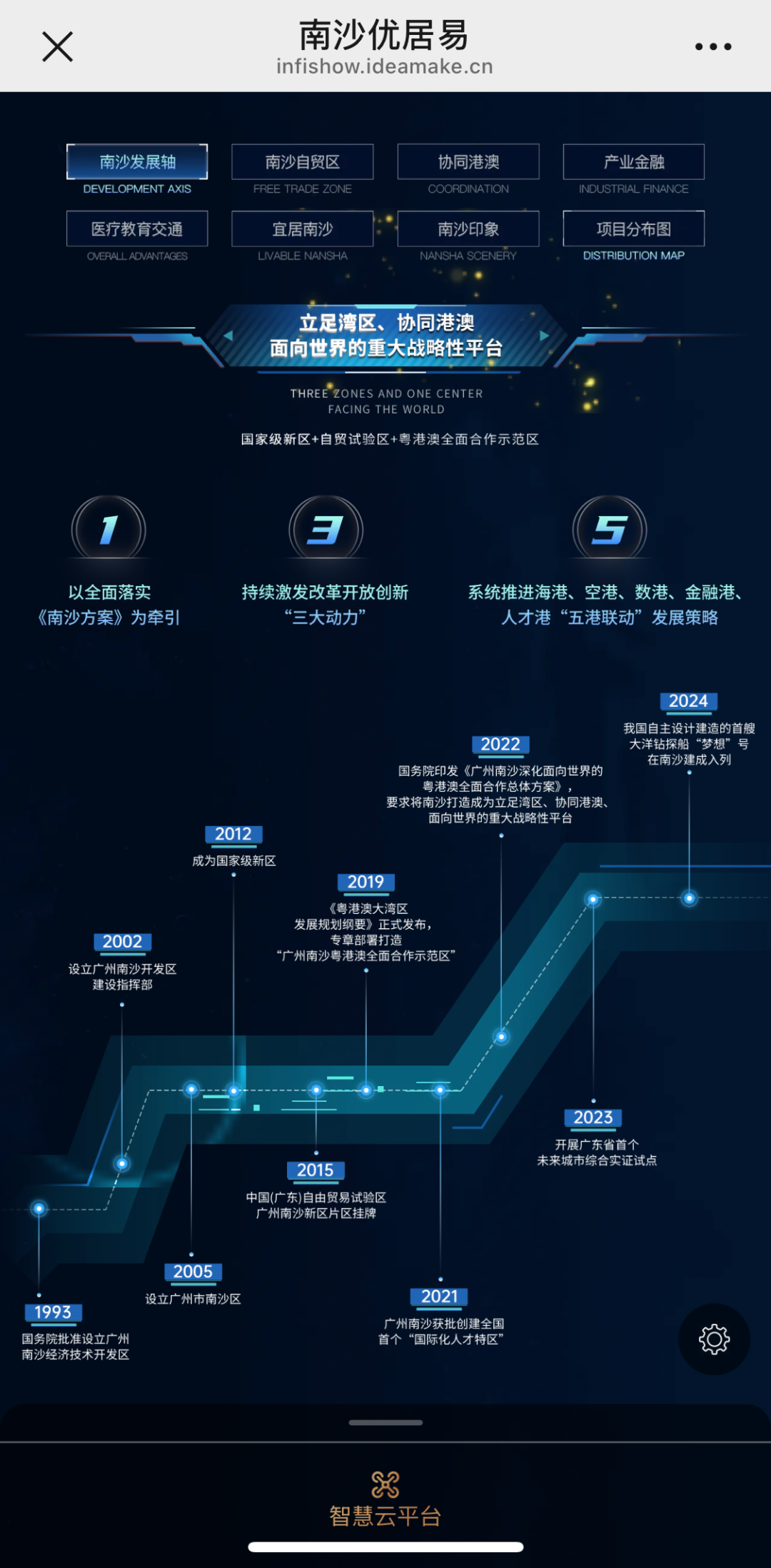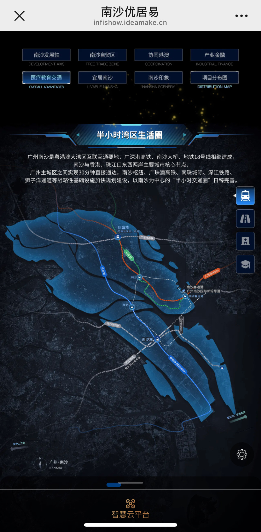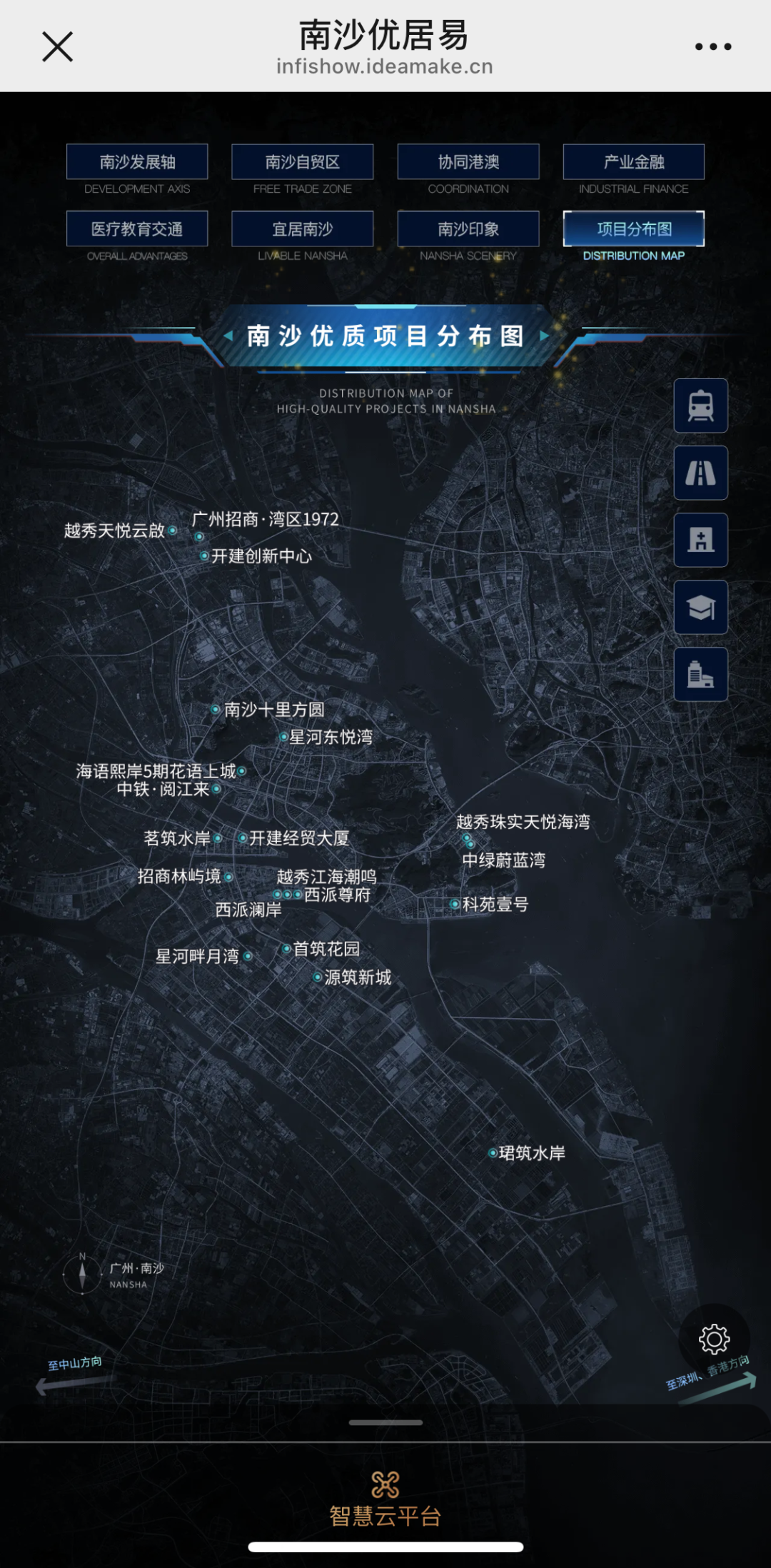 “南沙优居易”作为“一站式、集成化、便利化”便民服务平台,由“南沙发展概况”和“楼盘项目介绍”两大核心内容组成,共设置南沙发展轴、自贸区功能布局、协同港澳战略、产业金融体系、医疗教育交通优势、宜居南沙配套服务、房地产项目分布等8个功能模块,采用航拍、AI技术打造多维度、立体化的呈现方式,给予沉浸式置业体验。