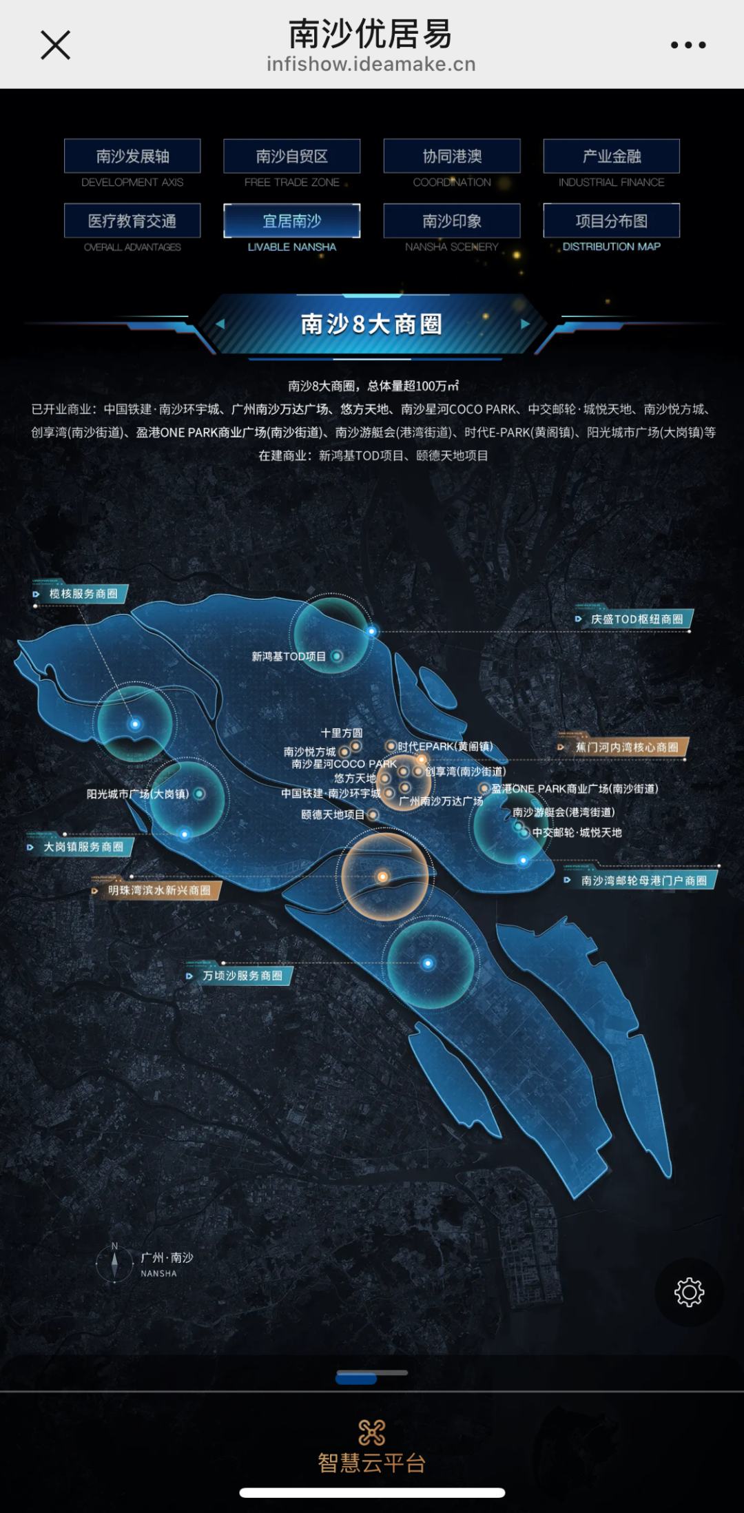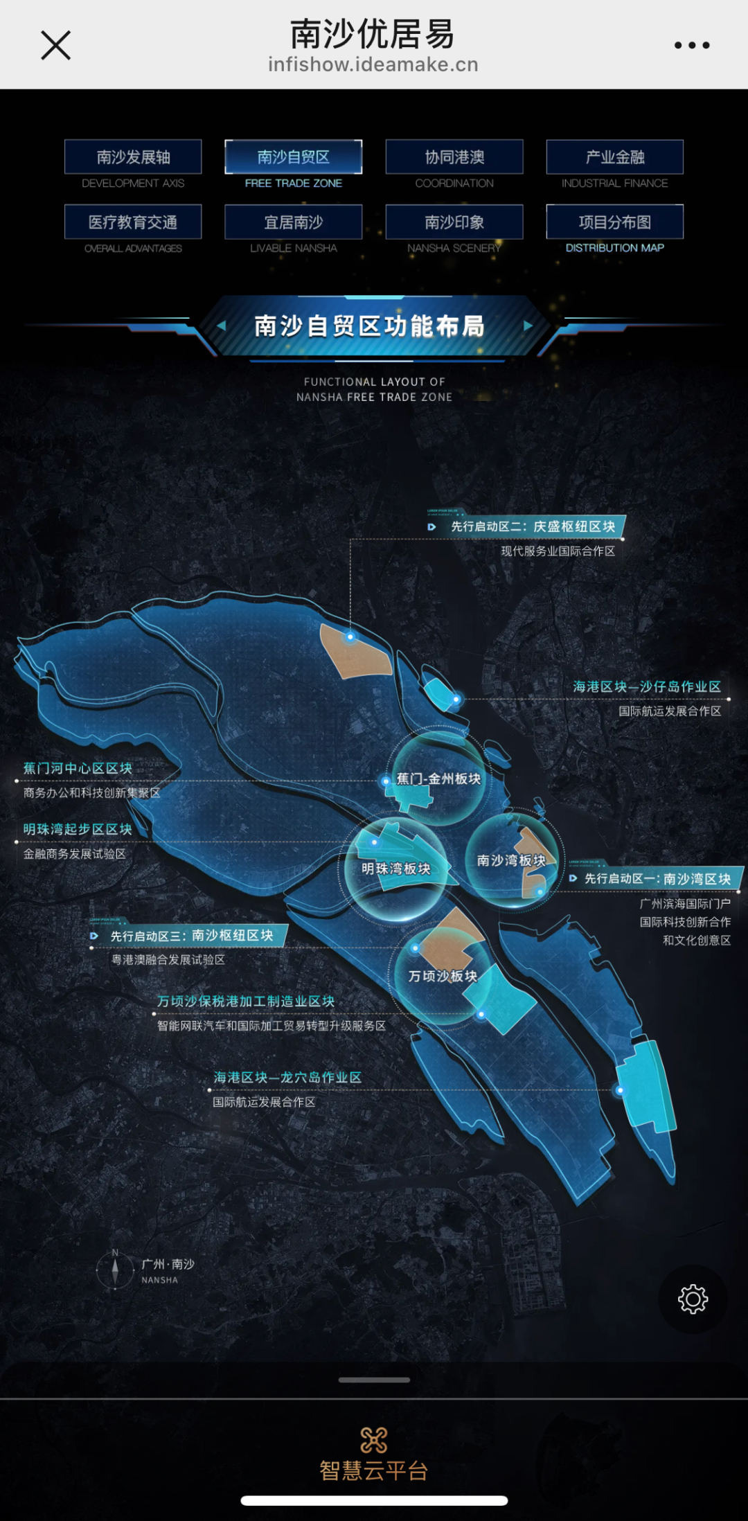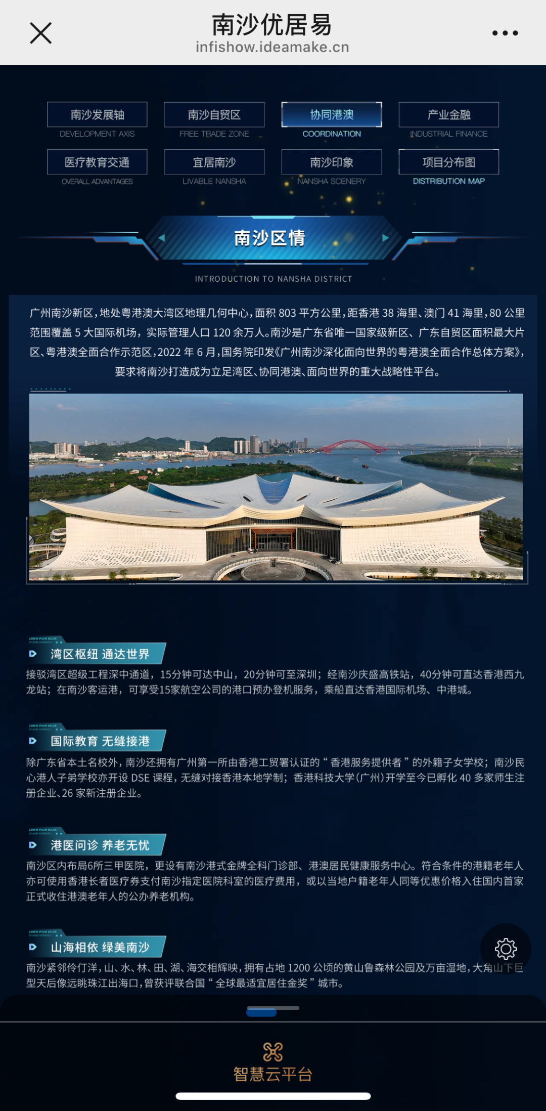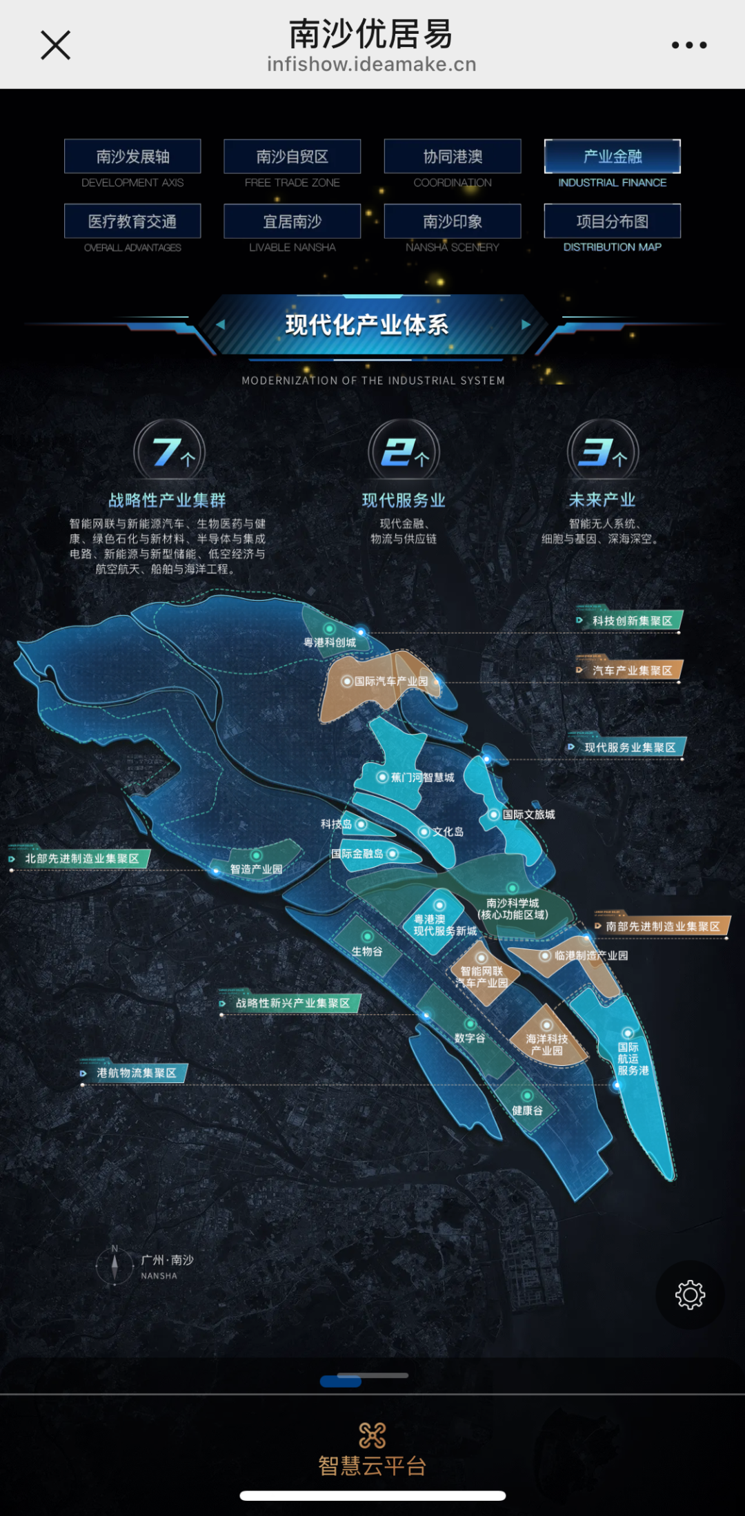 “南沙优居易”作为“一站式、集成化、便利化”便民服务平台,由“南沙发展概况”和“楼盘项目介绍”两大核心内容组成,共设置南沙发展轴、自贸区功能布局、协同港澳战略、产业金融体系、医疗教育交通优势、宜居南沙配套服务、房地产项目分布等8个功能模块,采用航拍、AI技术打造多维度、立体化的呈现方式,给予沉浸式置业体验。