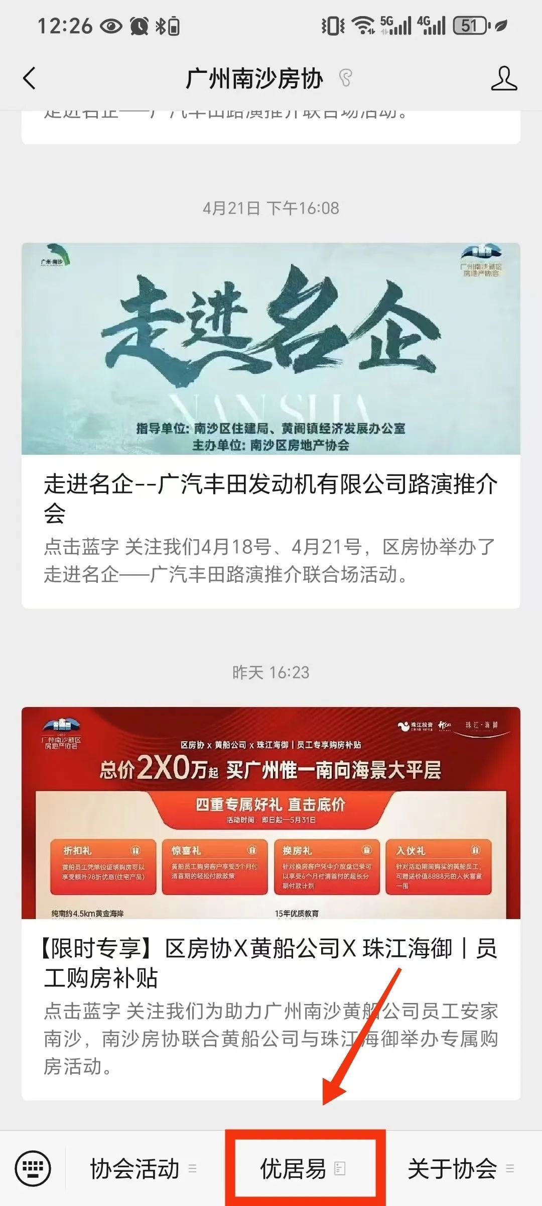 路径一:关注“广州南沙房协”微信公众号,进入会话窗口点击“优居易”。