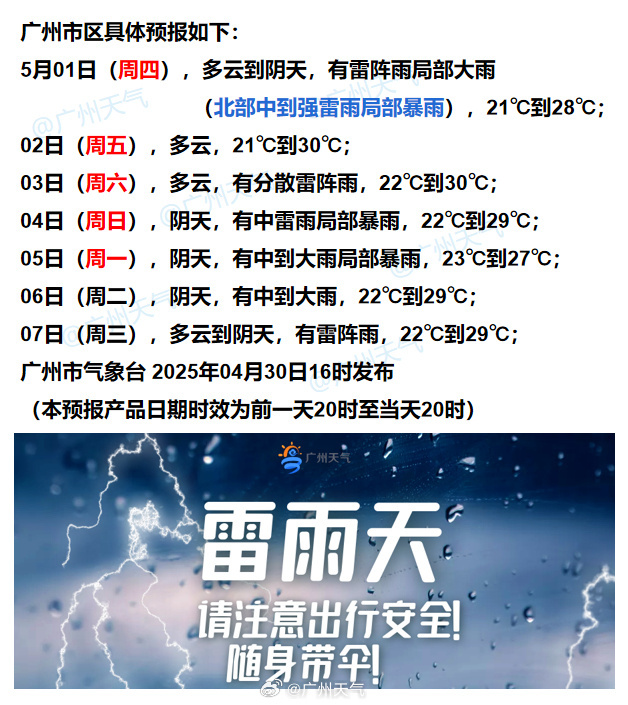 据广州天气,“五一”假期广州雷雨频繁,除了2-3日雷雨减弱,去程、返程高峰期的雷雨都比较明显。出门在外要注意交通安全,及时留意当地的天气预报预警。