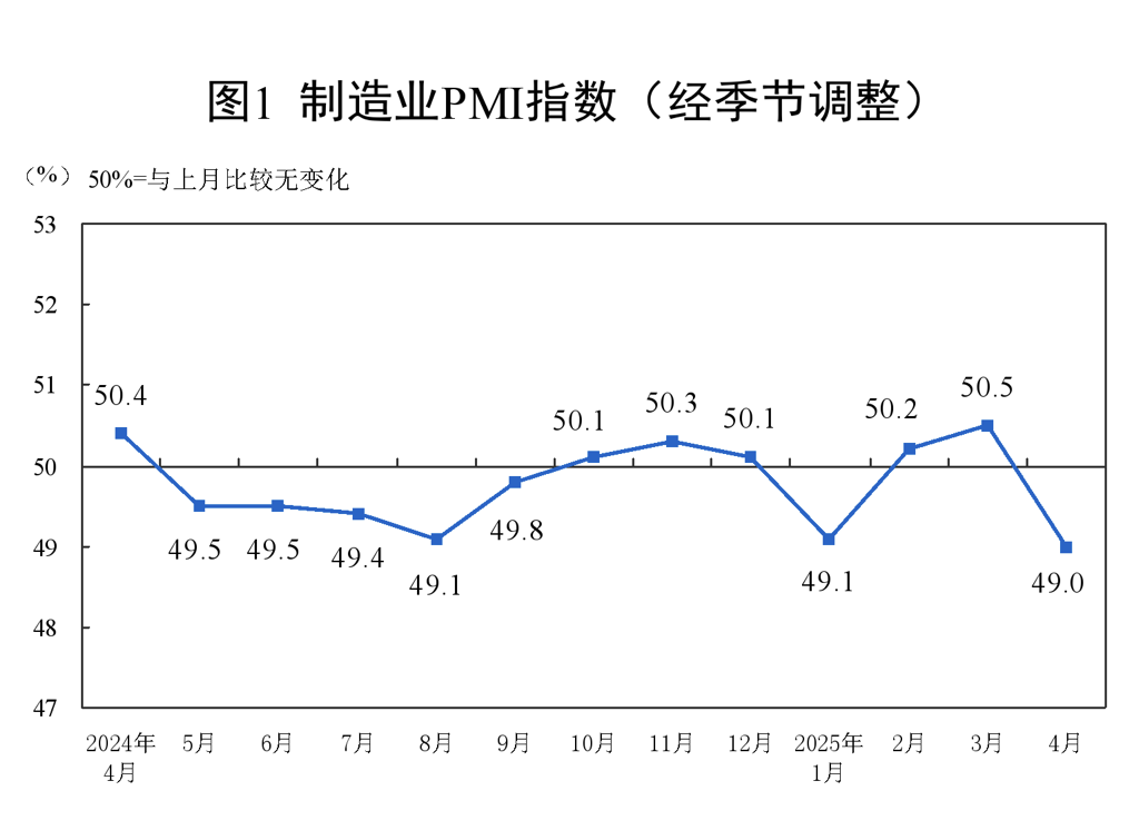 4月30日,国家统计局公布2025年4月中国采购经理指数运行情况。数据显示,4月份,制造业采购经理指数(PMI)为49.0%,比上月下降1.5个百分点,制造业景气水平有所回落;非制造业商务活动指数为50.4%,比上月下降0.4个百分点,仍高于临界点,非制造业继续保持扩张;综合PMI产出指数为50.2%,比上月下降1.2个百分点,继续高于临界点,表明我国企业生产经营活动保持扩张。