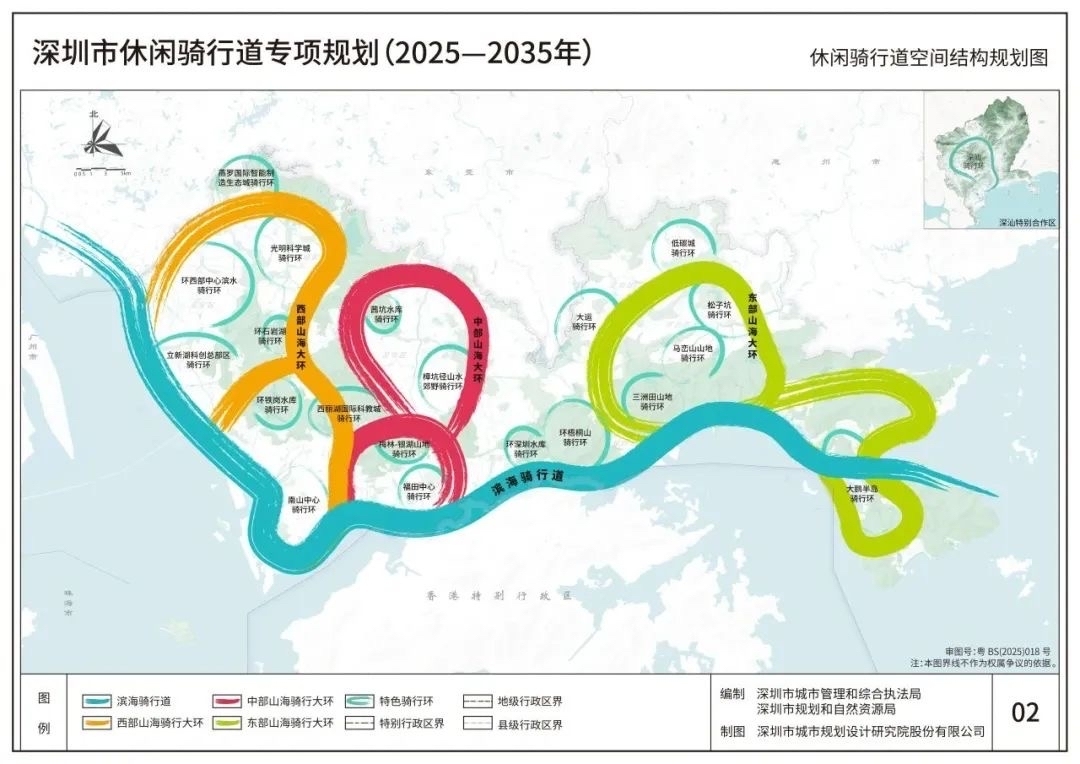 1条滨海骑行道,西起茅洲河口,东至大鹏鹿嘴,全长200公里,串联起“三湾一洋一河”。3个山海骑行大环,西部环线展现科创活力,中部环线融合都市繁华,东部环线彰显山海壮美,形成3个百公里级的骑行大环。N个特色骑行环,因地制宜建设各自超20公里的“环湖、沿河、穿林、绕城”主题特色骑行环,串联重要城市节点、功能区块,连通大型绿廊、河流、水库、山体等自然景观。