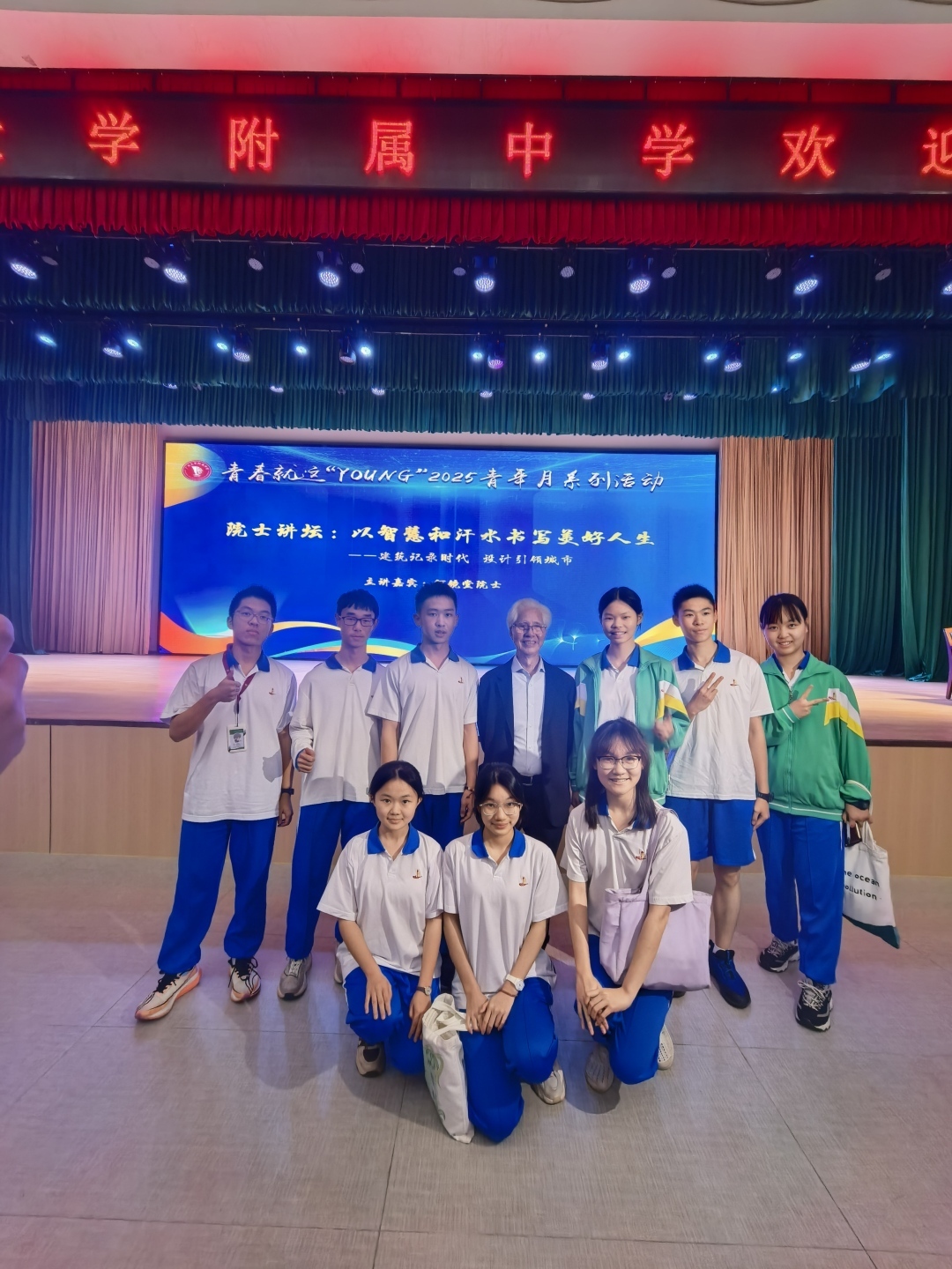 面对中学校园里的莘莘学子,何院士也回忆起了自己的中学时光。他说,自己当时喜欢数理化,又热爱绘画,在老师的建议下,他将建筑设计作为毕生的志业,走上了“半个工程师,半个艺术家“建筑师之路。何院士向同学们分享到:勤奋、才能、人品、机遇是一个人获得成功的要素,缺一不可。国家的改革开放,社会的持续发展,为我们提供了一个人生奋斗的大舞台。机会人人平等,勤奋、才能、人品需要从青少年开始培养,一生努力,不断发展和完善,抓紧机会就能成功。