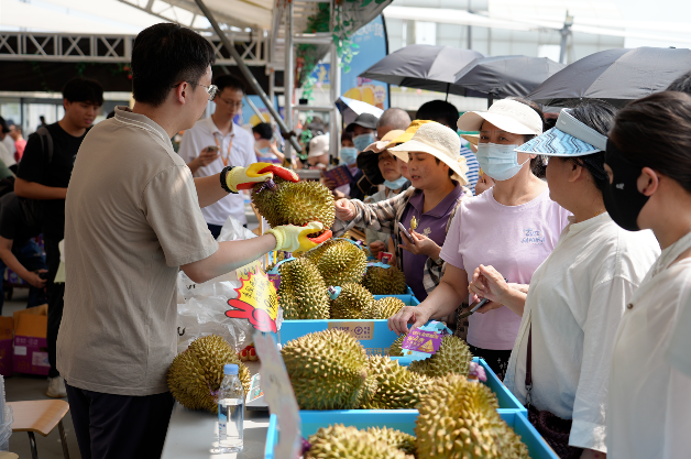 4月29日,2025年南沙港口新鲜集市榴莲嘉年华火热启幕!南沙港口新鲜集市满载热带风情,来自泰国的金枕、猫山王等榴莲鲜果到港“开柜即售”,活动持续至5月3日,龙穴港口“新鲜果园”将为市民带来一场别开生面的热带风情体验。